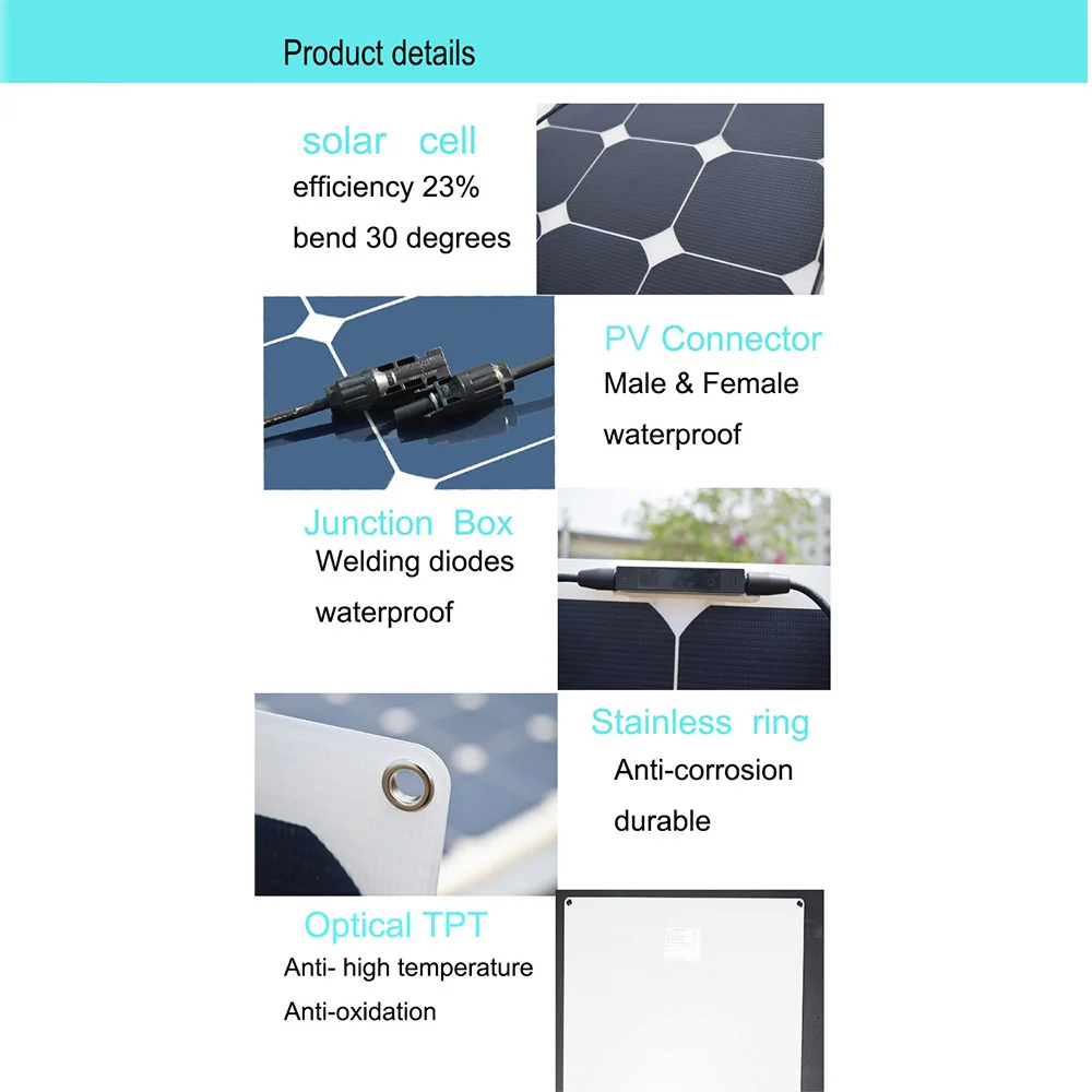 2015 г. 1 предметЛегкая гибкая полугибкая солнечная панель, 50 Вт, 18 в, 12 В Солнечная батарея, эффективность до 22%-25%, в то время как большая часть панелей составляет 17%-19% ✔Легкий, гибкий, очень прочный, устойчив к дождю, соленой воде, пыли и болям. В нем используется PV-разъем, устойчивый к атмосферным воздействиям ✔Сгибаемый, идеально подходит для хранения в жестких пространствах или людных местах, которые, как правило, не подходят для традиционных моделей из стекла и алюминия. Обратите внимание: не сгибайте панели. Это гибкие панели, не сгибаемые панели. ✔Простая установка. Уникальная конструкция без рамки имеет 4 металлических усиленных монтажных отверстия на каждом углу для крепления винтов, также может быть прикреплена клеем, втулками, стяжками на молнии или липучкой; Может быть установлена без дорогостоящих структурных усилений крыши. Отверстия на панелях предварительно просверлены для быстрого монтажа и крепления, идеально подходят для непостоянных установок ✔Для получения более подробной информации об этом товаре перейдите к описанию товара Описание товара Размер: 50 Ватт ★Солнечная батарея Полугибкая солнечная панель мощностью 50 Вт, 12 В использует мощную солнечную батарею Sunpower с высоким коэффициентом преобразования для максимального использования доступного солнечного света, А PV-разъем обеспечивает безопасность во время зарядки. Кроме того, изготовлен из прочного и долговечного материала, он легкий и гибкий для быстрой и легкой установки. ★Высокая производительность и универсальное применение в любом месте Упаковка с мощностью 50 Вт за счет экологически чистой солнечной энергии и работает как небьющееся зарядное устройство солнечной батареи, солнечная панель Контурная и гибкая по дуге против изогнутых областей до максимум 30 градусов, В то время как 4 коррозионностойких металлических монтажных отверстия позволяют установить его на крыше, RV, лодке, кабине, Палатка или любая другая Неровная поверхность, что делает ее идеальной для дома, путешествий, кемпинга и пеших прогулок. ★Спецификация: Оптимальная мощность [Pmax]: 50 Вт Рабочее напряжение [ВМП]: 17,6 в Рабочий ток [Imp]: 2,84 A Ток короткого замыкания [Isc]: 3,05 A Напряжение открытого замыкания [Voc]: 21,6 в Размеры: 545*535 мм * 3 мм Сопротивление воздуху: 50psf (2400 паcалов) Снегостойкость: 113psf (5400 шт.) Удар градом: 25 мм (1 дюйм) при 23 м/с (52 миль/ч) Вес нетто: 1,2 кг Обратите внимание: Пластиковая пленка используется для защиты панели, как и пленка телефона, пожалуйста, удалите ее при использовании.