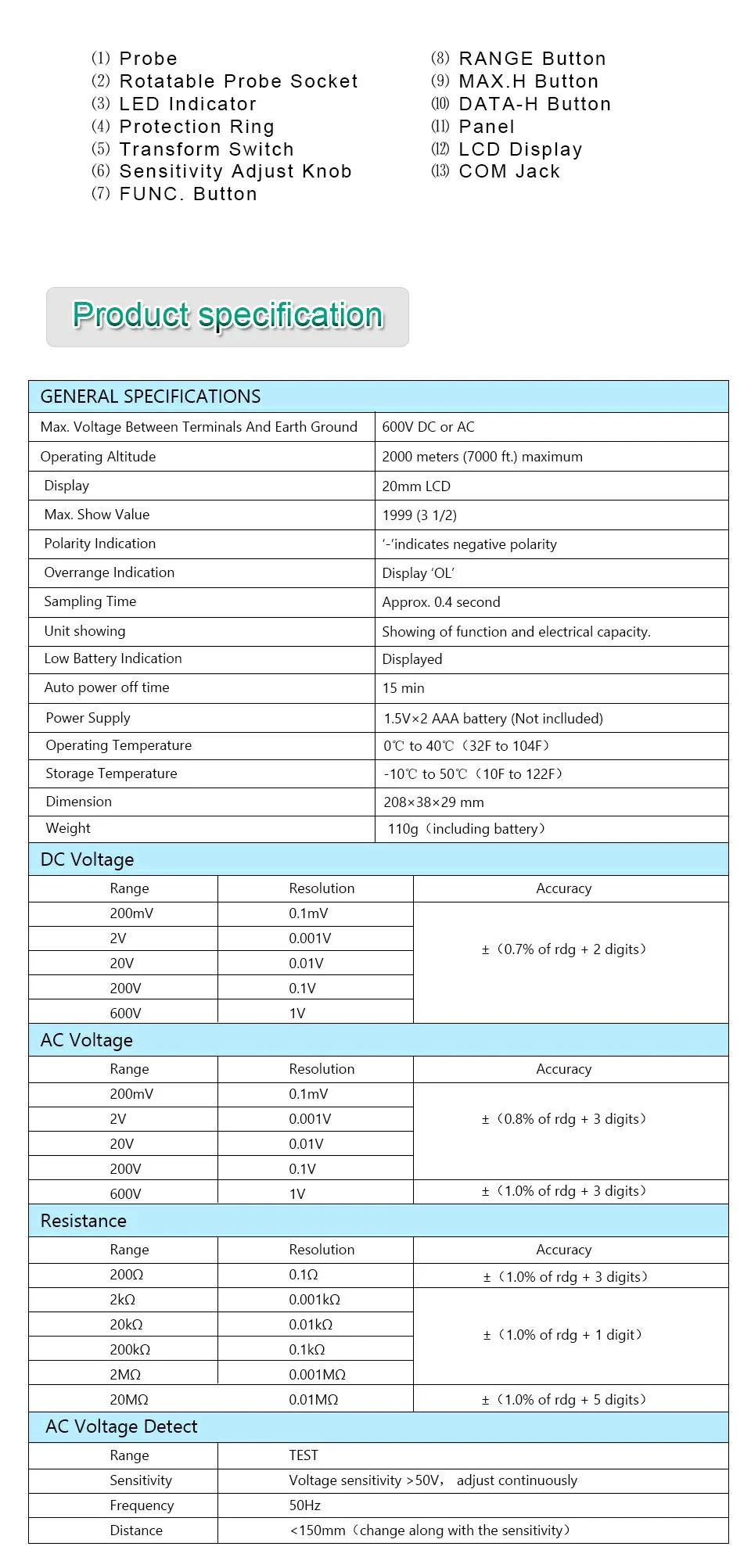 DCV: 200 m/2/20/200/600 V +/-0.7%,