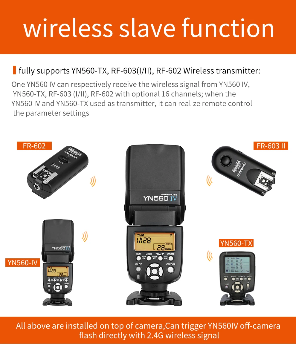 Один YN560 IV может соответственно получать беспроводной сигнал от YN560 IV, YN560-TX, RF-603 (I/II), RF-602 с опциональными 16 каналами; Когда YN560 IV и YN560-TX используются в качестве передатчика, он может осуществлять дистанционное управление настройками параметров.