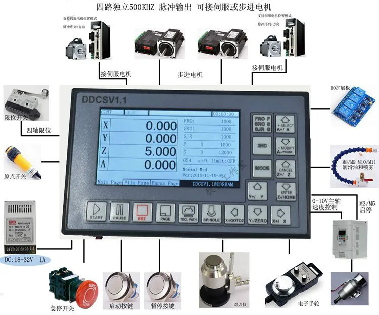 1, автономная система, без компьютера, без другого контрольного оборудования 2, Управление 4 шагового двигателя 3, с 15 входным интерфейсом, включая ограничитель и другие функции. 4, с 4 программируемыми выходными интерфейсами, включая водяное охлаждение, аэрозольное охлаждение и другие контролируемые периферийные устройства. 5. Двойной режим регулировки скорости вращения шпинделя VSO (0-10 в). 6. Независимое программное обеспечение системы проектирования. 7, интерфейс USB, поддержка общей системы u-диска. 8, DCDC электрическая изоляция 9. Спрос на Электропитание: 18-32VDC1A DC источник питания 10, самый высокий 500K шаговый двигатель управления импульсный выход, подходит для большинства потребностей системы станков. 11: Поддержка стандартного ручного импульса. 12: поддержка стандартной системы кода G. 13: Встроенный чехол, легко устанавливается на любую панель шкафа. 14: интегрированная система стабильности источника питания, может бороться с электромагнитными помехами двигателя шпинделя. 15: высокоскоростной чип выходного интерфейса, обеспечивает достаточный ток и импульсный сигнал частоты. 16: мастер-чип промышленного класса, улучшает стабильность системы. 17: Поддержка сохранения точки останова, в любое время сбой питания, может сохранить точку останова, может продолжать обрабатывать после повторного запуска 18: поддерживает автоматическую настройку инструмента, удобно и быстро 19: технология онлайн чтения, поддержка большого объема u-диска, поддержка g-кода, любой размер файла можно читать. Три области применения