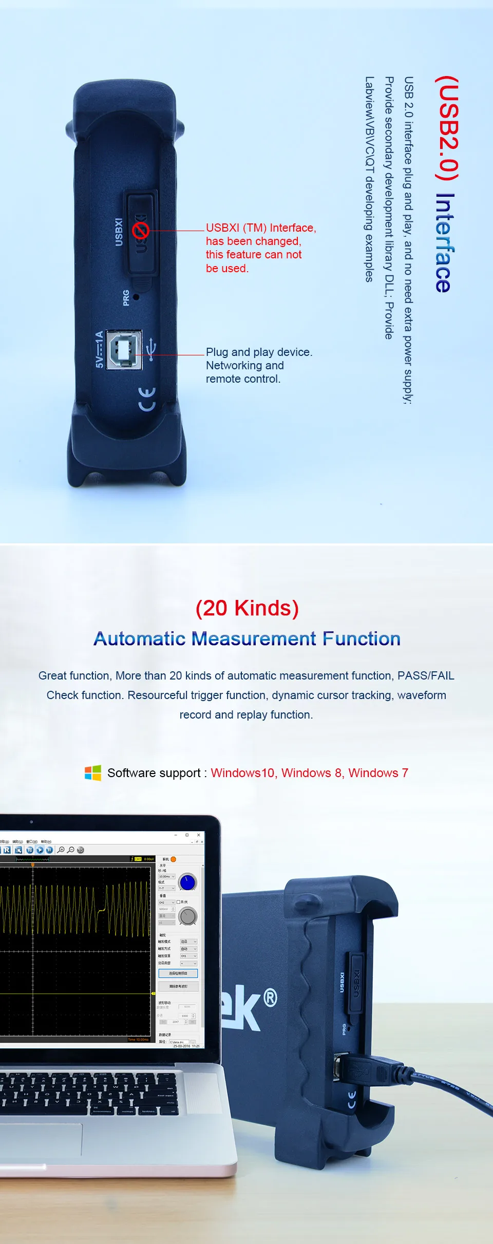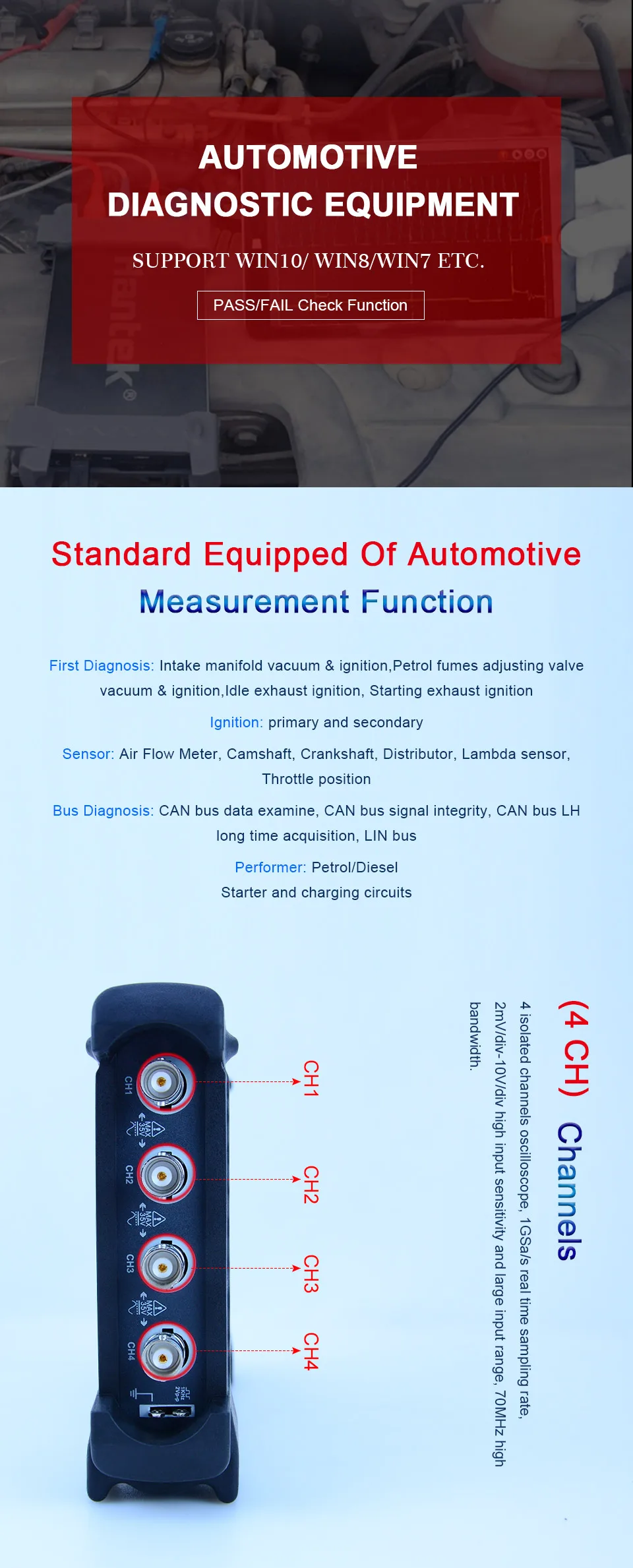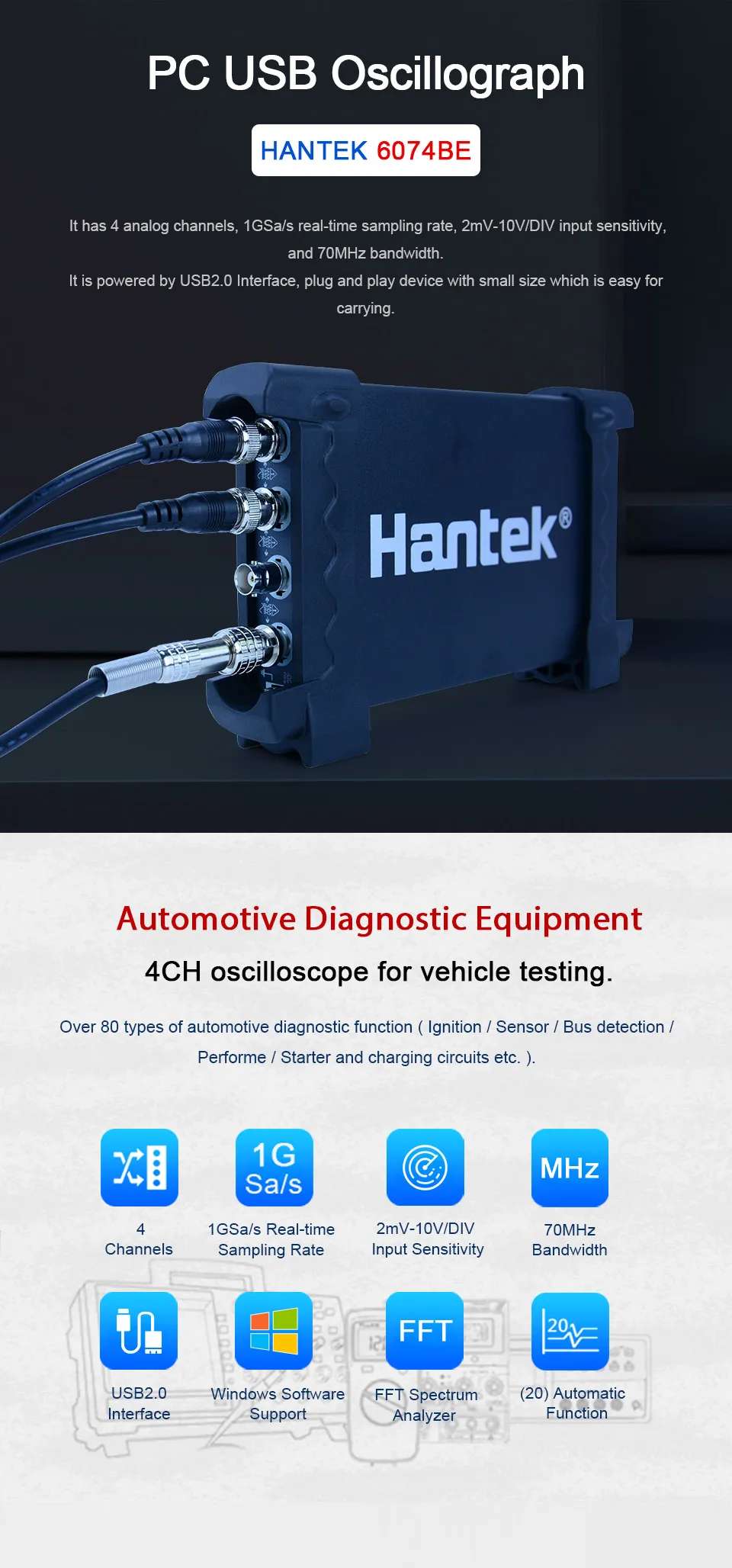 Набор серий Hantek6074BE Стандарт оснащен более чем 80 типами автомобильных измерительных функций (действие зажигания/датчик/Диагностика автобуса/исполнитель/запуск и зарядка); Интерфейс USB 2,0 подключи и работай, и нет необходимости в дополнительном источнике питания; поддержка планшетного ПК; Поддержка WIN10/ WIN8/WIN7 и т. Д. Бесплатное программное обеспечение постоянно обновляется, высокая производительность; Поддержка USBXI, простота в эксплуатации. 4 изолированных канала осциллографа, 1gsa/s частота дискретизации в реальном времени, 2 мВ-10 В/DIV Высокая Входная чувствительность и большой входной диапазон, 70 МГц высокая полоса пропускания, малый размер, легко носить с собой. Динамическое отслеживание курсора, запись сигнала и функция воспроизведения. Особенности 1. Стандартный оснащены более 80 видов автомобильных функции измерения; Первый диагноз: впускной коллектор вакуум зажигание, бензиновые испарения регулировки клапана вакуумный зажигания, простое зажигание выхлопа, начиная с зажигание выхлопа; Зажигания: начальной и средней школы; Сенсор: расходомер воздуха, распределительный вал, коленчатый вал, распределитель, лямбда-датчик, положение дроссельной заслонки; Диагностика шины: можно проверить данные шины, целостность сигнала CAN-шины, CAN bus LH долгое время приобретения, LIN bus;Performer: бензин/дизель 2. Подходит для портативных компьютеров, настольных ПК и подходит для использования на мобильных телефонах и деловых поездок. Поддержка WIN10/ WIN8/WIN7 и т. Д. 3.USB 2,0 интерфейс подключи и работай, и не нужен дополнительный источник питания; 4. Отличная функция, более 20 видов автоматической функции измерения, функция проверки пропуска/сбоя. Находчивая функция триггера, динамическое отслеживание курсора, запись сигнала и функция воспроизведения. 5. Хороший Механический дизайн с небольшим размером, который легко носить с собой. Внешний чехол изготовлен из того же материала, что и анодированный алюминий для iPad. Он обладает большой термостойкостью и абразивной стойкостью с красивым внешним видом. Твердость поверхности алюминиевого сплава значительно улучшается. 6. 4 изолированных канала осциллографа, 1gsa/s частота дискретизации в реальном времени, 2 мВ-10 В/DIV Высокая Входная чувствительность и большой входной диапазон, 70 МГц высокая полоса пропускания, 7. Данные формы сигнала могут быть выведены в EXCEL,BMP,JPG. 8. Усреднение формы волны, последующее свечение, контроль легкости, обратное, добавление, вычитание, размножение, разделение, X-Y дисплей. 9. Анализатор спектра FFT 10. Один компьютер может подключаться к нескольким осциллографам, легко увеличить номер канала. 11. Предоставление вторичной библиотеки развития DLL; Предоставление примера разработки Labview \ VB \ VC \ QT Технические характеристики