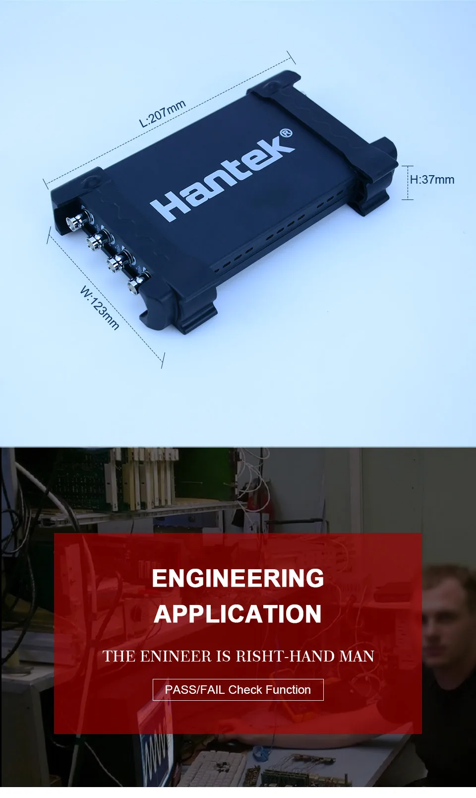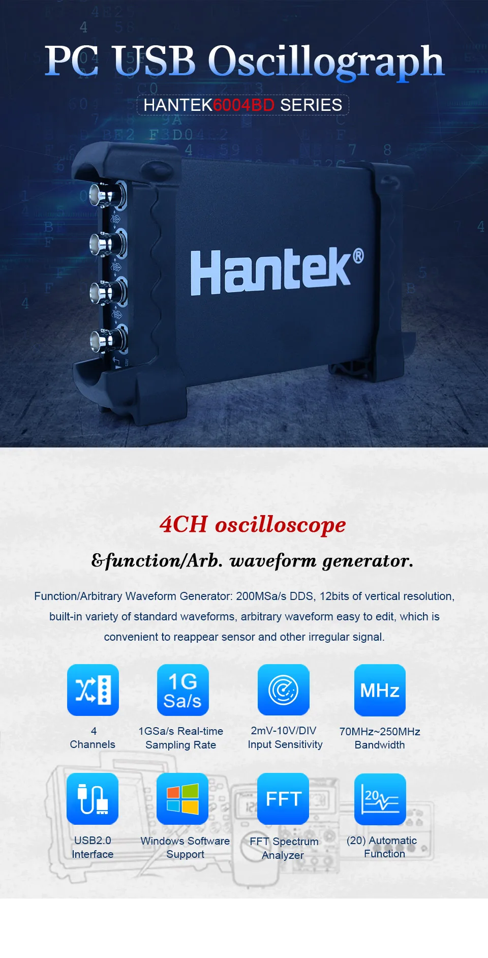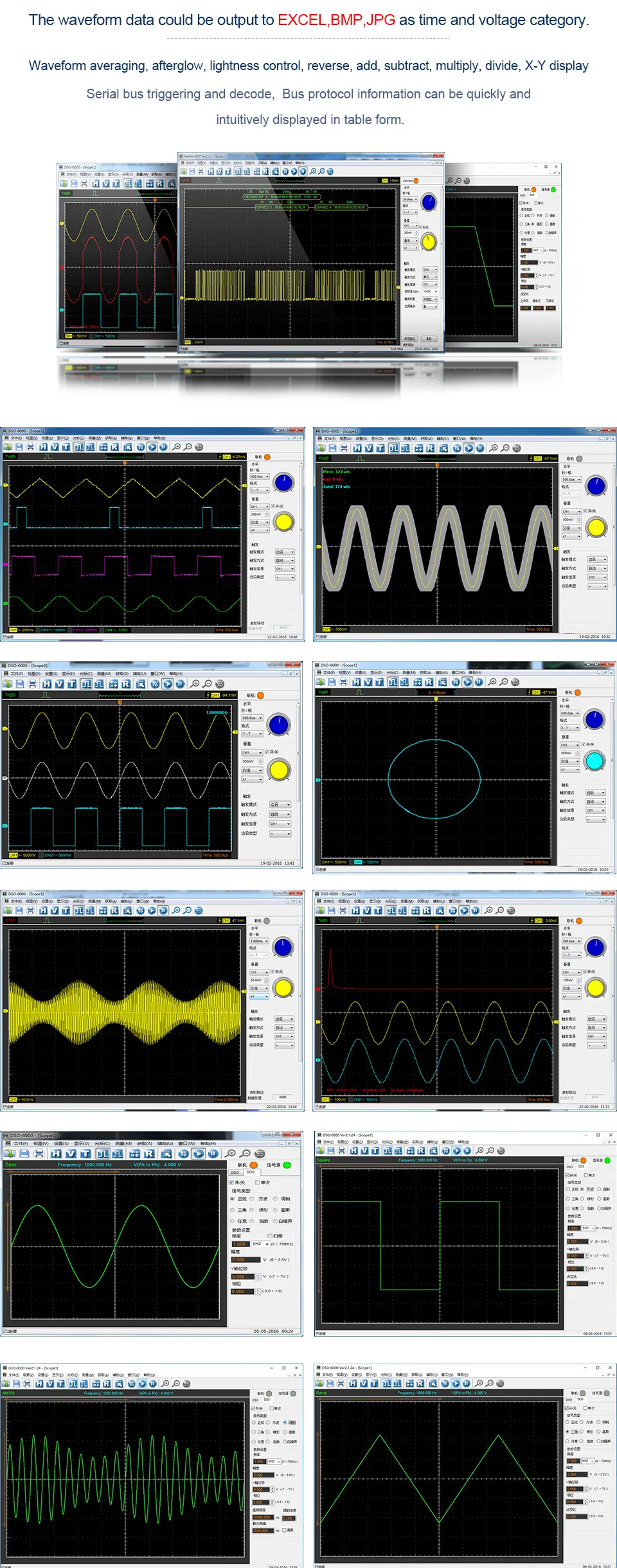 > Тест на прохождение/сбой, находчивая функция триггера, динамическое отслеживание курсора, запись формы волны и функция воспроизведения. Интерфейс работы похож на banchtop осциллограф, прост в эксплуатации с высокой производительностью.