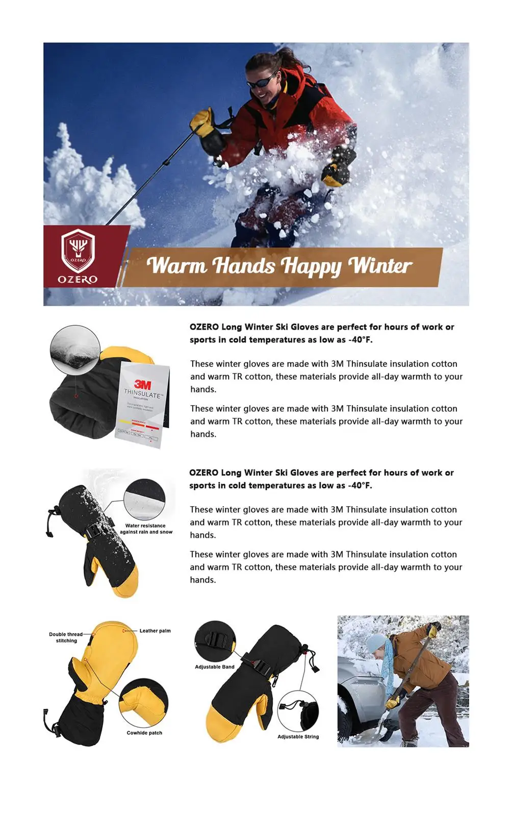 Длинные зимние лыжные перчатки OZERO идеально подходят для часов работы или занятий спортом при низких температурах до-40 °F.