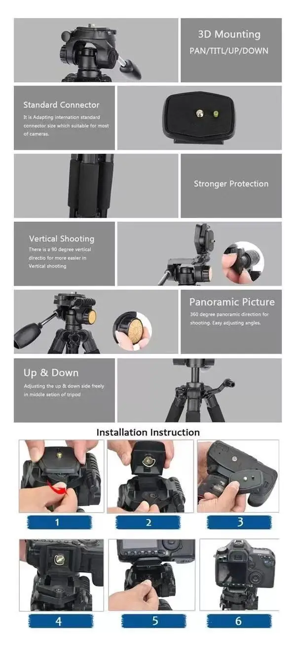 Особенности: Изготовлен из алюминиевой трубки высокой плотности, прочный и стабильный. Двойной уровень духа, три регулировочных ручки дизайн демпфирующий эффект шаровой головки, реализуя любой угол съемки, точный и эффективный. БЫСТРОРАЗЪЕМНАЯ пластина с надежным зажимом и резиновым ковриком, двойная защита камеры от падения аварии. Фиксатор регулировки угла ноги обеспечивает одиночную регулировку каждой ноги. 4-секционный Колонка ногу с быстрое освобождение замки для удобной работы ногами, которую вы хотите высоту при съемке. Функция перевернутой центральной оси обеспечивает самую низкую съемку. Оснащенный стальным рокером, вы можете отрегулировать шаровую головку во время съемки. Дизайн ручки для подъема оси, более удобный в использовании. Нескользящие резиновые ножки. Портативный карман позволяет легко носить с собой. Лучший выбор для SLR камеры в вашем путешествии. Характеристики: Модель: Q111 Материал: алюминиевый сплав Тип головки: трехмерная шариковая головка Длина в сложенном виде: 50 см (с шаровой головкой) Максимальная высота штатива: 150 см Макс. Диаметр трубки: 20 мм/0.8in Количество столбцов: 4 секции Несущая способность: принимает массу весом до 5 кг/11.02Lb Вес изделия: 1,252 кг/2,76 фунтов (с шаровой головкой) Размер посылка: 12*12*51 см/4,7*4,7 * 20.08in Посылка Вес: 1,6 кг/3.52Lb посылка напылением Упаковочный лист: 1 * Штатив с шаровой головкой 1 * сумка для переноски Примечание: В комплект поставки входит только штатив с шаровой головкой.