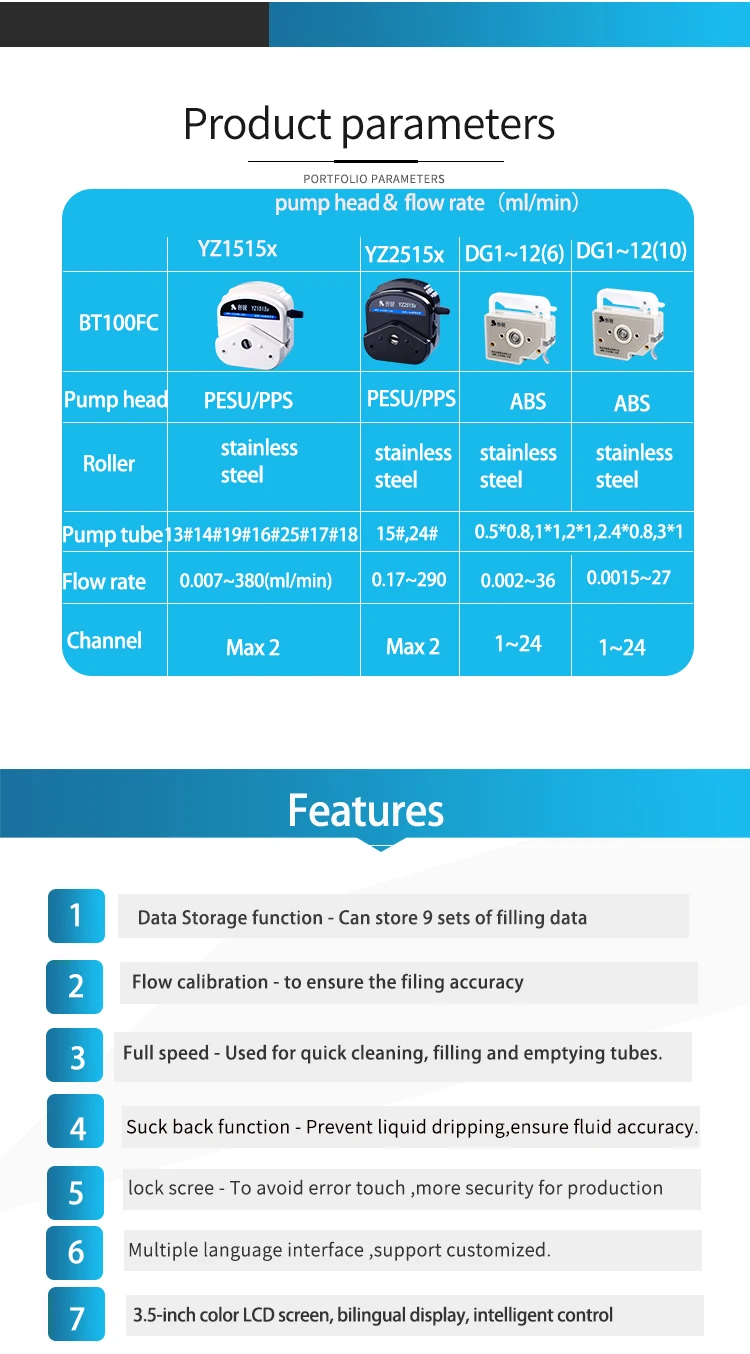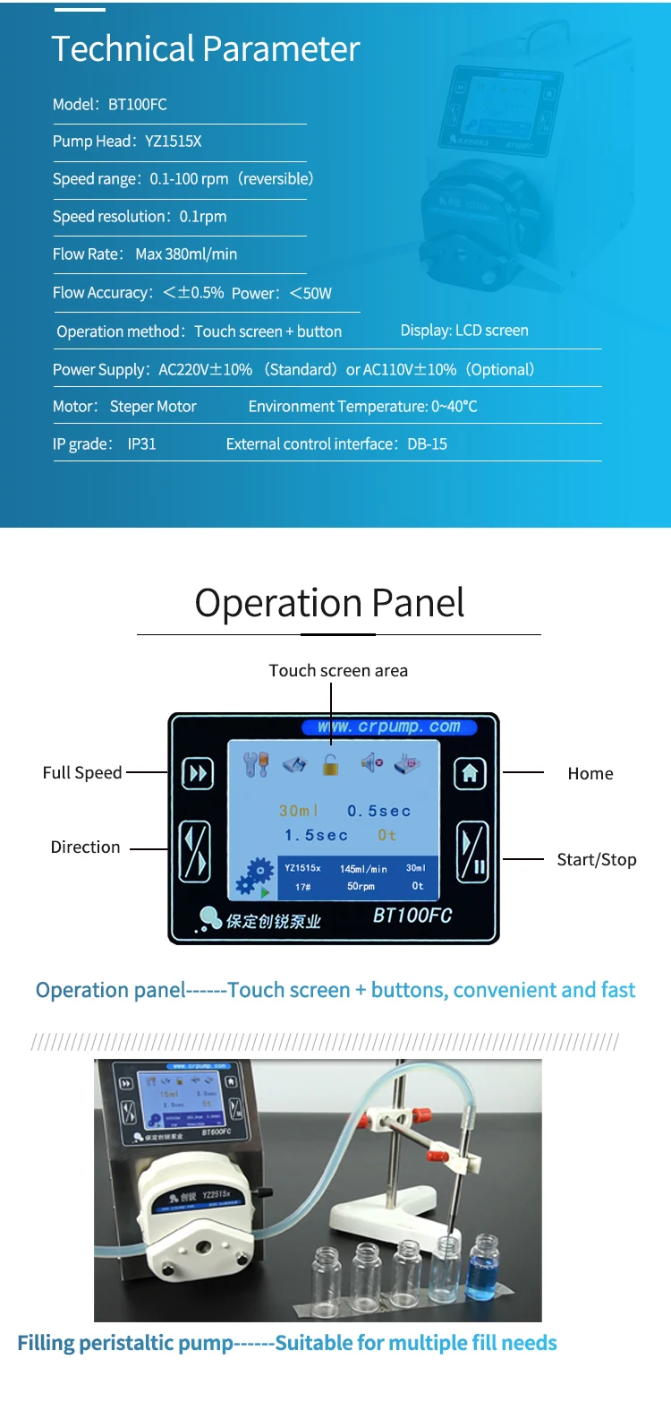 Перистальтический насос BT100FC/YZ1515x с управлением педалью для ног имеет сенсорный цветной ЖК-экран для отображения меню настройки Бегов и параметров, параметры заполнения и дисплей потока просты и интуитивно понятны, просты в эксплуатации. Он также имеет функцию калибровки потока, когда отклонение объема заполнения через эту калибровку, чтобы удовлетворить требования пользователей высокоточного наполнения. С различными методами управления, с интерфейсом связи для обеспечения пользователей с протоколом связи, пользователи могут запросить Пользовательское программное обеспечение ПК для дистанционного управления.