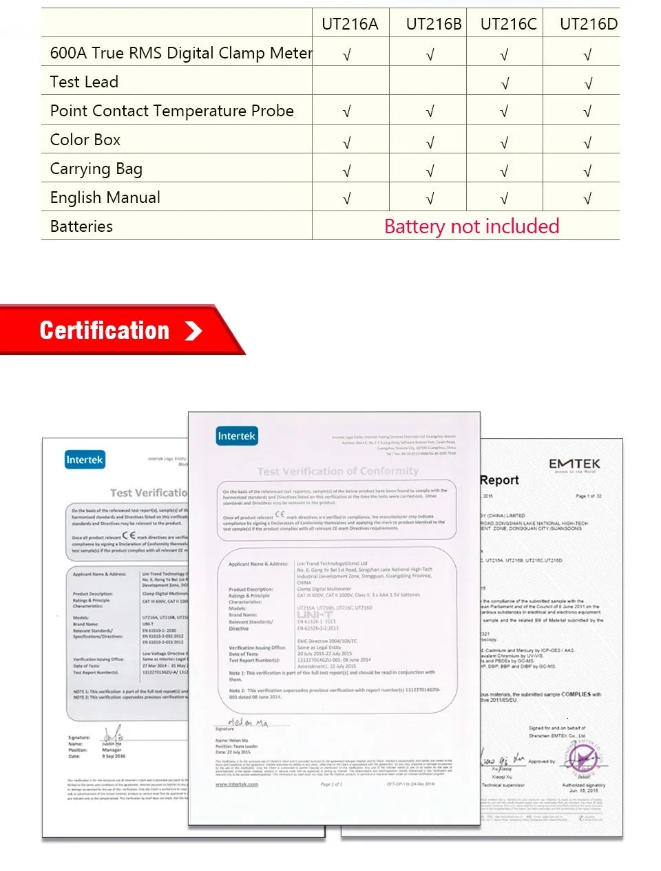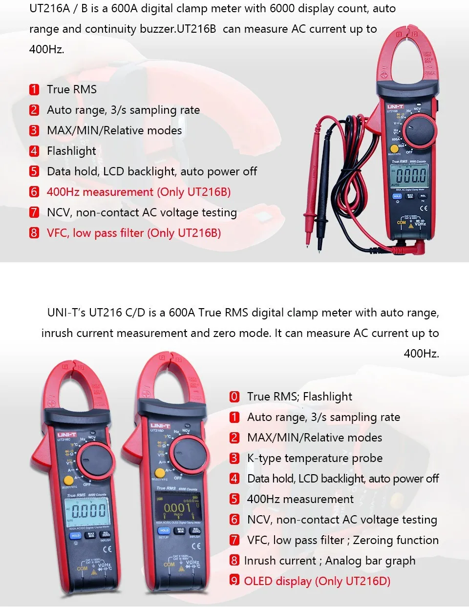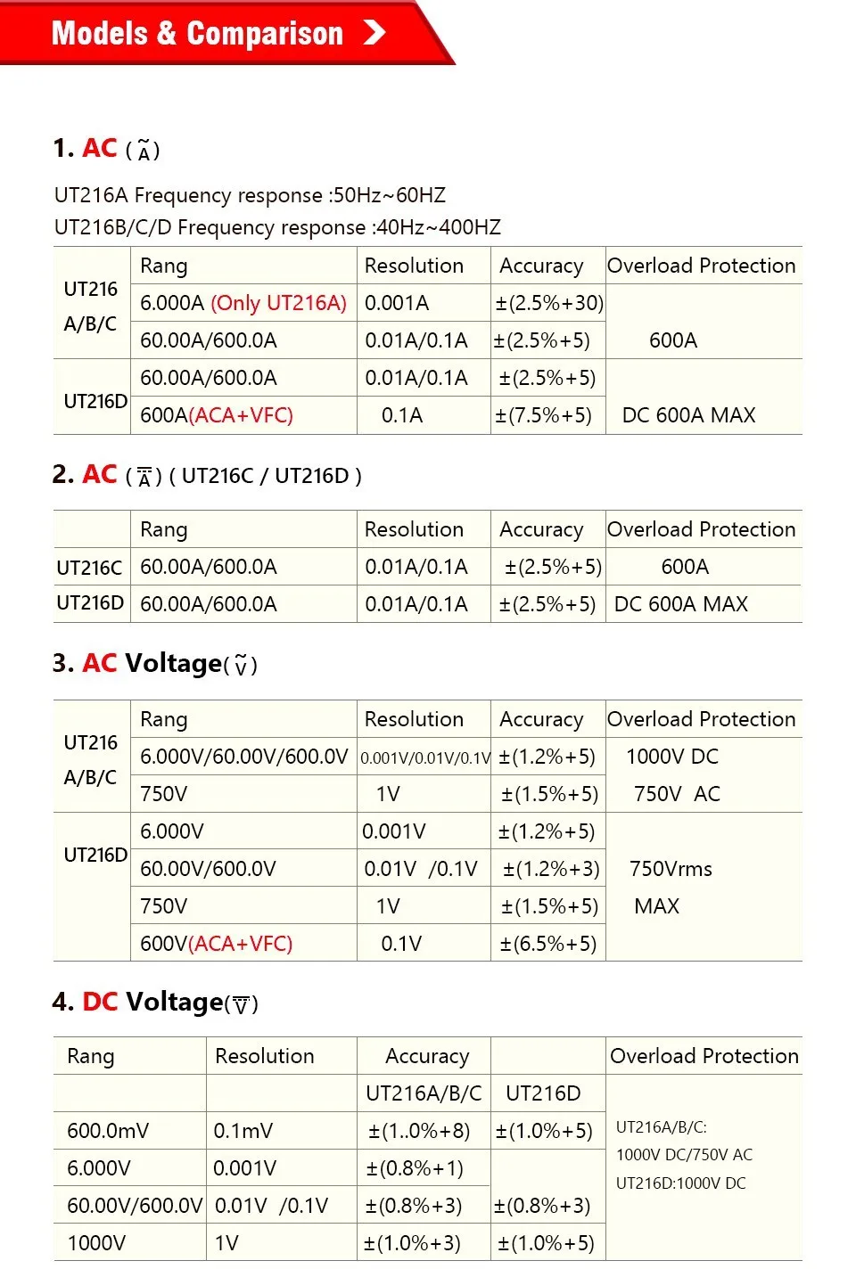 | Технические характеристики | Диапазон | UT216A | UT216B | UT216C | UT216D |