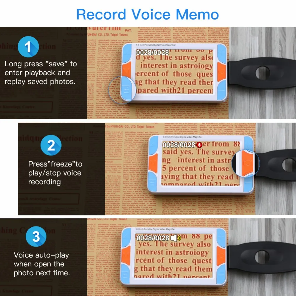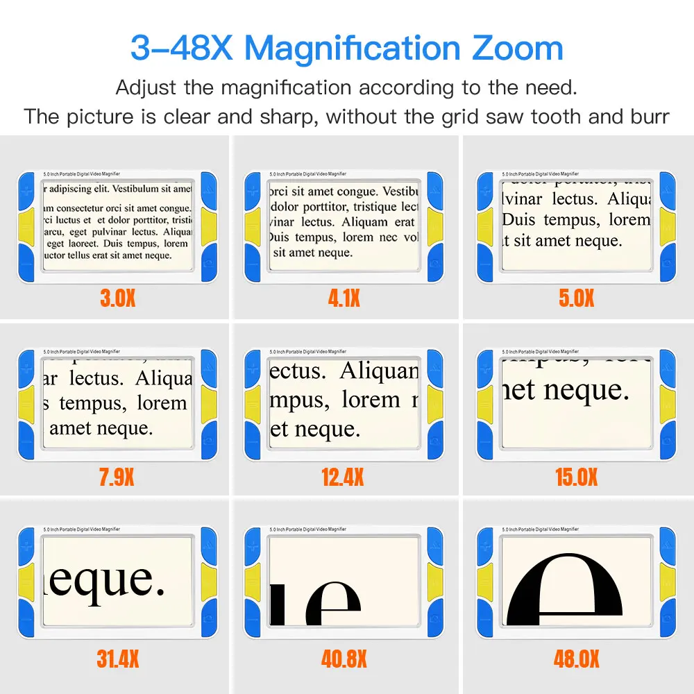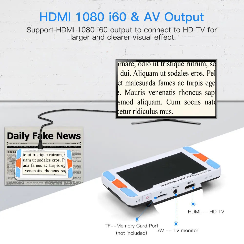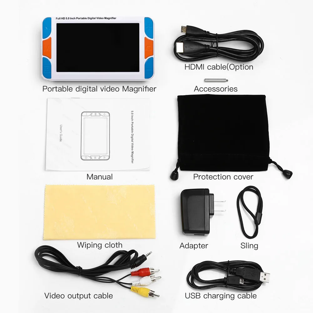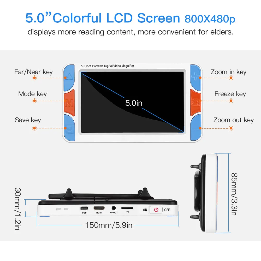 Спецификация:Модель: UM005EОписаниеПортативный 5 дюймов лупа для ЖК-экранов для расстояние и крупным планом просмотра/Высокое разрешение карманный цифровой Лупа с 5 "ЖК-монитор/5” ЖКД на тонкопленочных транзисторах на тонкоплёночных транзисторах Портативный цифровой видео лупаУвеличение: 3 X-48X бесконечный непрерывный зумДисплей: 5 дюймов HD TFT LCDРазрешение: QVGA 840x480Цветовые режимы: 26 режимовФокус: расстояние и крупным планомВыход видео: AV out, HDMIБатарея: литиевая аккумуляторная батарея (4 часа непрерывного использования, 6 часов зарядки)Размер: 150*84*30 ммВес: 350 гОсобенности1) изображение замораживания2) Подсветка при чтении текста по горизонтали и вертикали3) Широкоугольный объектив, широкое поле для чтения4) голосовая инструкция5) изображения могут быть записаны, сохранены, отозваны и загружены на ПК6) автоматический сон через 2 минуты, если устройство не работаетЭтот продукт будет предлагать тот, кто имеет низкое видение, большой опыт в чтении и написанииВысокая скорость 60 кадров в секунду, умный расчет, без остановок, наслаждайтесь расслабленным чтением5 дюймов большой экран, 800*480 HD эффективныйШирокоугольный дизайн, 3-48X бесконечная ЛупаДвойная конструкция камеры, возможность просмотра как далеко, так и рядомЗамораживание экрана, точное считываниеАвтоматическое хранение данных, воспроизведение и просмотр, когда вам нужноЭлектронный занавес, избегайте помех на светильникГолосовое напоминание, простое управлениеЗадний светильник с яркостью, светильник с регулировкой интенсивностиФонарик, предлагаем Временное ОсвещениеСъемный аккумулятор большой емкости, экономит мощность интеллектуально (непрерывная работа до 4 часов, без дальнейшей работы кнопки до 2 мин, автоматически выключается)Супер тонкие портативные визуальные средства, поддержка функции ручкиПредлагаем расслабляющий опыт чтения, свободный почеркВыход HDMI 1080i60, подключение к HD телевизору, большой экран5 дюймов большой экран, 800*480 HD, 3-48X зум; HDMI 1080i60 выход и AV out: подключение к HD ТВАккумулятор: перезаряжаемый и сменный, 2500 мАч. Время работы-4 часаБлокировка экрана: замораживание текстового изображения на экране для более удобного чтения; Функция голосовой подсказкиДвойная конструкция камеры: Включите клавишу питания, затем нажмите верхнюю правую синюю кнопку (клавиша расстояния). Если включен задний светильник, переходит в режим закрытого вида для чтения; Если задний светильник выключен, введите Режим удаленного обзора для дальнего видения.Принять дизайн интеллектуального электричества провинции, если изображение все еще в течение 2 минут, лупа автоматически отключится.