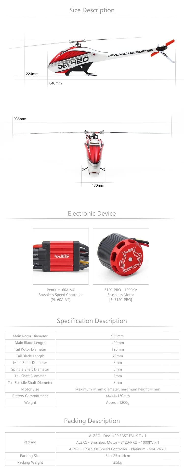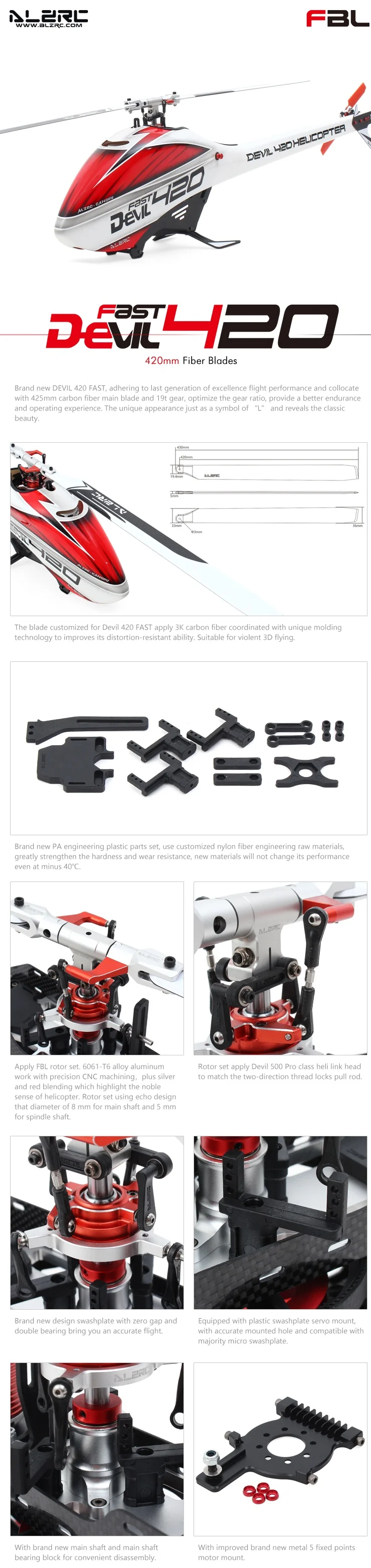 Совершенно новый дьявол 420 быстро, придерживаясь последнего поколения превосходной производительности полета и collocate с 425 мм основным лезвием из углеродного волокна и зубчатой передачей 19t, оптимизируйте передаточное отношение, обеспечивают лучшую выносливость и опыт работы. Уникальный внешний вид как символ «L» и показывает классическую красоту. Спецификация: ● Диаметр главного ротора: 935 мм ● Длина основного лезвия: 420 мм ● Диаметр ротора хвоста: 196 мм ● Длина лезвия хвоста: 70 мм ● Диаметр главного вала: 8 мм ● Диаметр хвостового вала: 5 мм ● Размер двигателя: максимальный диаметр 41 мм, максимальная высота 41 мм. ● Батарейный отсек: 44x44x130мм Радиопередатчик и электронное оборудование, необходимое для сборки: 1. Передатчик: 6-канальный или больше, вертолет, Системы 2. Приемник: 6-канальный или больше 3. Шаг: цифровой шаг 4. Батарея: 6S/22,2 V 1500 ~ 2600mAh Li-Po батарея 5. Двигатель: RMC-BL3120 1000kv 6S бесщеточный мотор (5 мм шпиндель) x 1 6.ESC: 50 ~ 80A бесщеточный ESC x 1 7. Сервопривод Swashplate: микро Цифровой Металлический сервопривод x 3 8. Хвостовой замок сервопривода: Средний Цифровой Металлический сервопривод x 1 9. Гироскоп: безходовая Гироскопическая система x 1 10. Другие: набор инструментов для подключения и сборки Упаковка: 1.ALZRC - Devil 420 FAST FBL KIT x 1 2.ALZRC-бесщеточный мотор-3120-PRO - 1000KV x 1