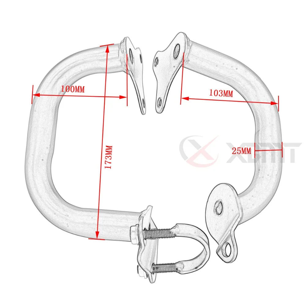 Описание продукта:Conditon: послепродажный товар 100% Новый брендМатериал: высококачественное металлическое покрытие поверхностиКоличество: 1 комплект (левая и правая сторона)Размер: как показано на картинкеЦвет: хром/черныйОсобенности:Стильный дизайн идеально подходит для украшения вашего мотоцикла, а также для защиты рамы и обтекателя от контакта с поверхностью в случае падения или скольжения.Высокое качество и хорошее рабочее состояние.Надежная защита важных деталей мотоцикла, крепкое соединение рамыДобавьте свой выбор предохранителя двигателя, установленный на шоссе колышки, чтобы изменить положение ноги на долгой езды.Простая установка, но рекомендуется установить профессионалом!Нет инструкции по установке и нет крепежного оборудования!Используйте имеющееся оборудование для крепления!Применимость: