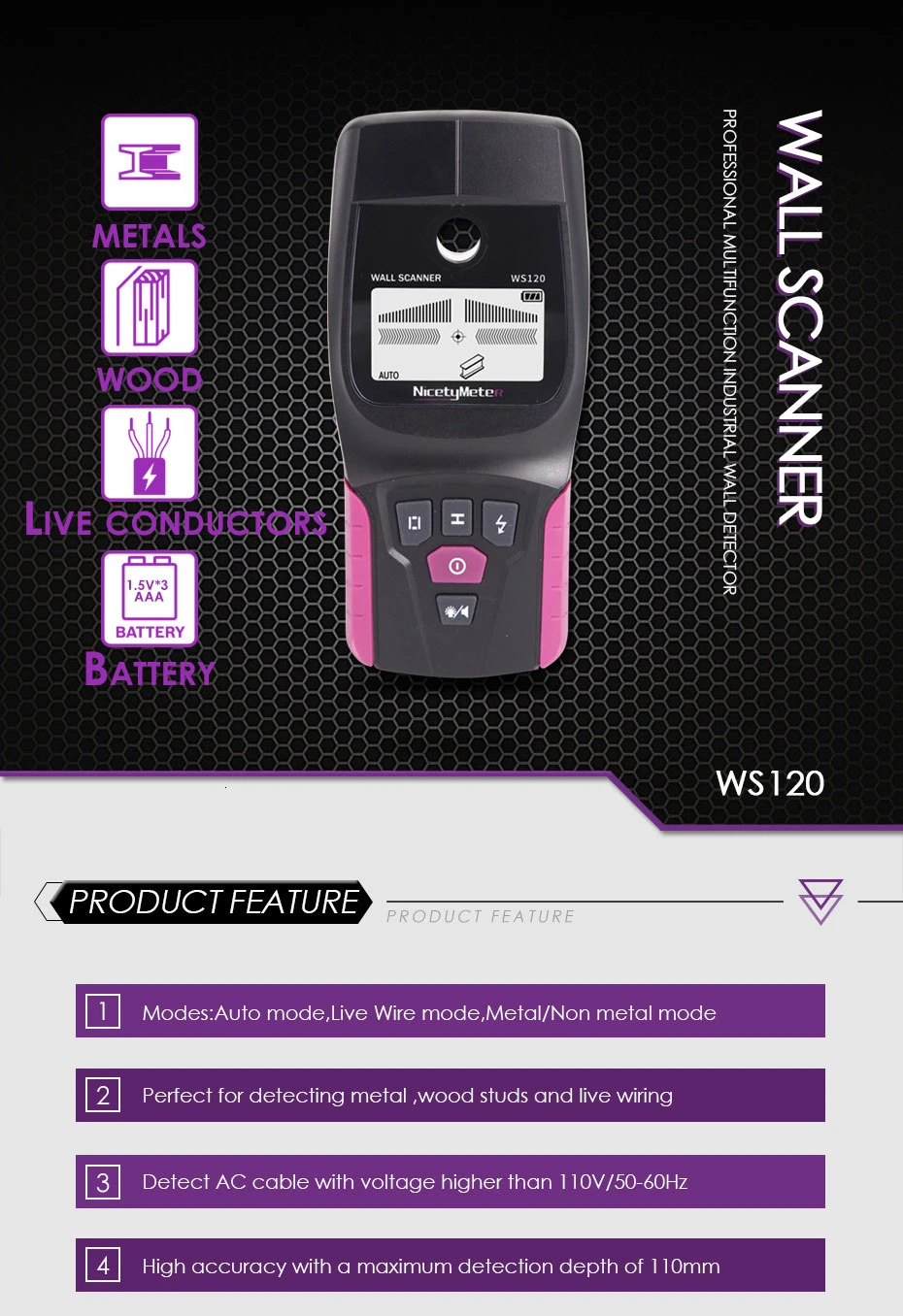 WS-120-это ручной настенный сканер для быстрого обнаружения магнитных металлов в стенах, на крыше и полу, таких как армирующие стали, железные трубы и немагнитные металлы, такие как алюминиевые трубы, медные трубы, И неметаллических материалов, таких как балки, водопроводные трубы из ПВХ, а также электрифицированных объектов, как живые провода.