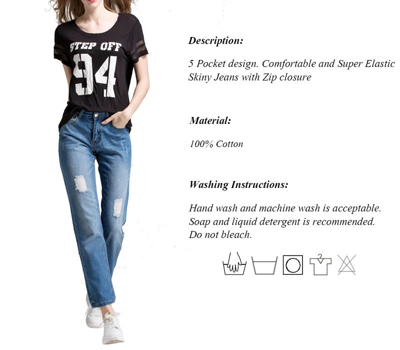 Уход за стиркой напоминание: так как наши джинсы непосредственно с фабрики упаковки для продажи, так что может быть немного запах джинсов. Если вы обнаружите запах, пожалуйста, не беспокойтесь, пока висит в прохладном месте, чтобы высохнуть, чтобы устранить запах.