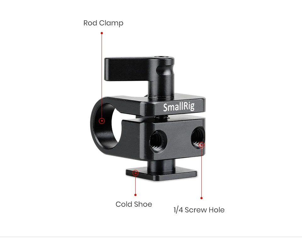 SMALLRIG 15 мм стержень зажим с обувью крепление 1597Позволяет подключать аксессуары к камерам DSLR. Это соответствует вашему требованию о переносе функции крепления обуви на зажим стержня. С одним стержнем 15 мм, вы можете прикрепить монитор, EVF и другие аксессуары. Один фиксирующий Трещоточный рычаг обеспечивает надежное затягивание зажима стержня и крепления холодной обуви. Корпус зажима стержня поставляется с двумя резьбовыми отверстиями 1/4 "для крепления дополнительных аксессуаров.