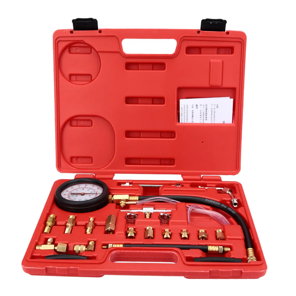 Этот набор для испытаний на впрыск бензина используется для тестирования давления бензинового топливного насоса на большинство транспортных средств, оснащенных впрыском топлива.