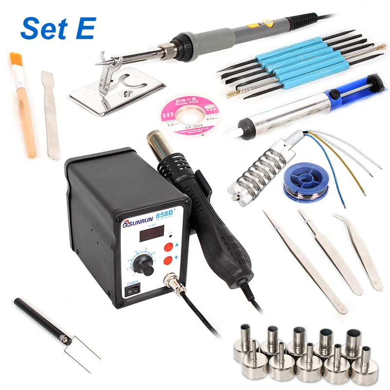 1 х Основной блок 1 x ручка 1 x IC Пикап 1 х Кабель питания 10 x Воздушный сопло 3 пинцета 1 x Запасной нагревательный элемент 1 x паяльная проволока Припой-1 шт. 5 х сварочная головка 1x60 Вт Электрический паяльник с отдельным выключателем питания 1 x подставка для паяльника 1 x распашной провод 1 x Маленькая Лопата 1 x Кисть 6 x SA-10 вспомогательный сварочный инструмент
