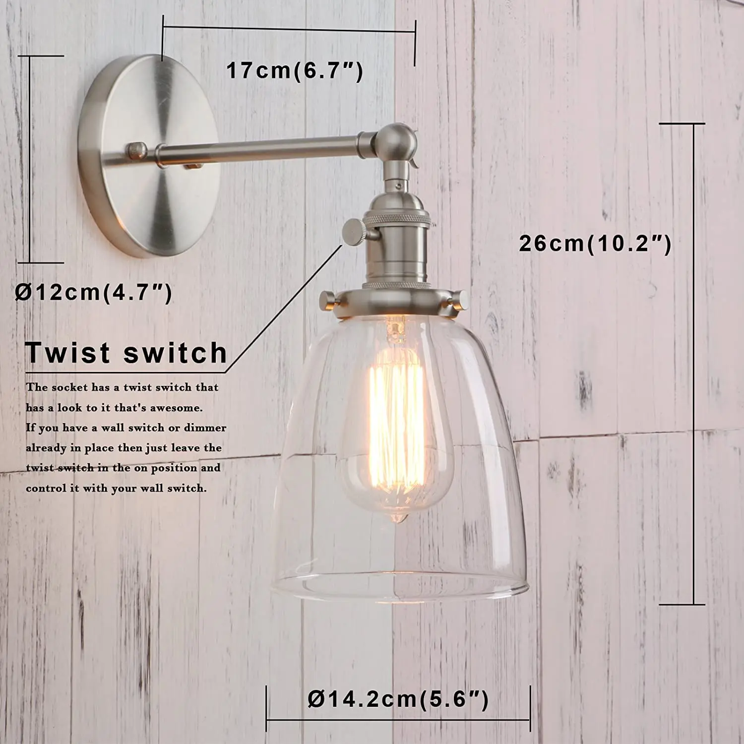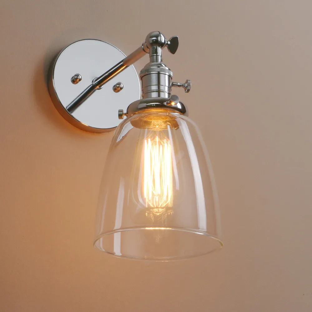 • Стиль: настенное бра • Материал: металл + стекло • Отделка: хром, медь, бронза, античный • Лампа: 14,2 см (5,6 дюймов) диам * 26 см (10,2 дюймов) H • Рулевой рычаг длина: 17 см (6,7 '') простираются от Монтажная пластина для локтевого сустава под углом 90 градусов. • Измерение Монтажная пластина основания: диаметр 12 см (4,7 ") • Монтажная пластина: с той же цветной монтажной пластиной, что и держатель лампы • Проводка: Жесткий провод к стене (требуется установка) • Оттенок: стеклянный абажур ручной работы использует традиционную промышленную технику Выдувания стекла для идеального художественного стиля стекла с небольшим внутренним пузырьком и максимальным освещением. • Характеристики гнезда: средняя Цоколь E27 (стандартный Размер) • Доступное напряжение 110-220 В. • Лампа: лампа в комплект не входит • Мощность лампы: 60 макс. мощность для использования с этим креплением. 40 Мощность те рекомендуется • Совместимый тип лампы: светодиод; Компактная флуоресцентная лампа (CFL); Галогенная лампа; Лампа накаливания. • Переключатель вкл./выкл. На розетке. Если у вас уже есть настенный выключатель или диммер, просто держите поворотный переключатель в положении on и используйте настенный переключатель для управления им.