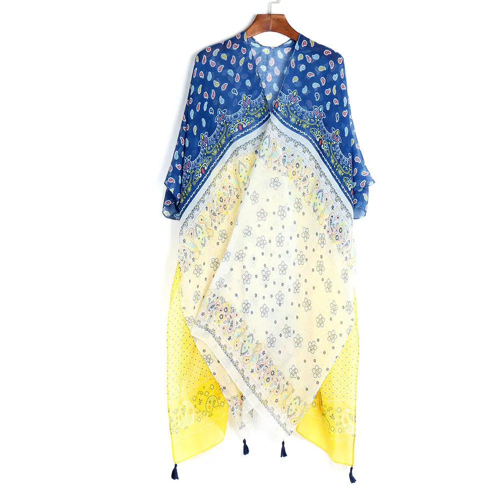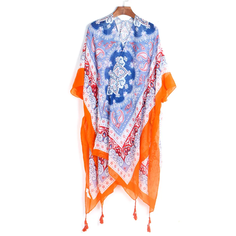 Женский длинный кардиган, оранжевый, синий, с принтом, для плавания, накидка, vestidos, сексуальный купальник, Пляжная туника, платье для плавания, чудо-кисточка