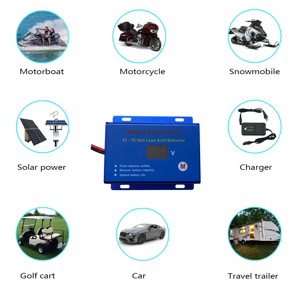 Поддерживайте и оживляйте свинцово-кислотные батареи, используемые в гольф-картах, электромобилях, мотоцикле, автомобиле, грузовиках, лодках, солнечных батареях, вилочных вилках, резервных источниках питания.