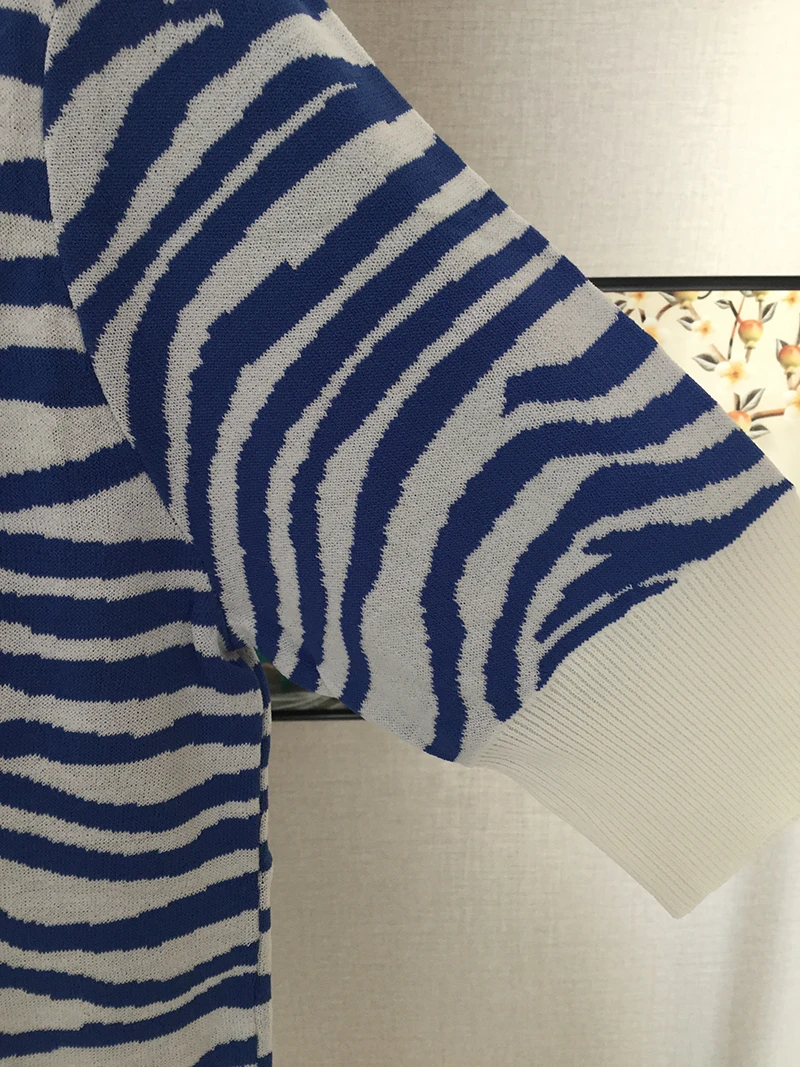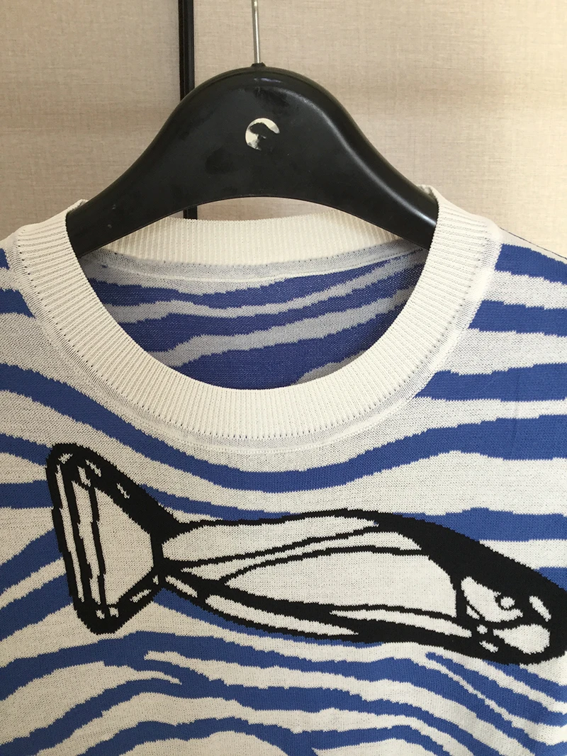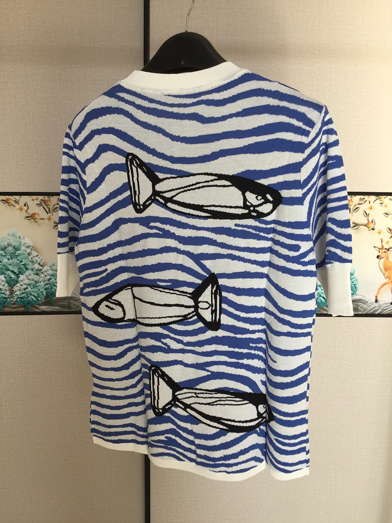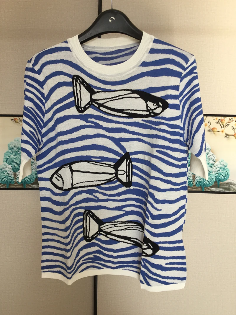 2022 весна осень синий полосатый свитер с рыбками женский короткий рукав вязаный пуловер с круглым вырезом Тонкий Топ