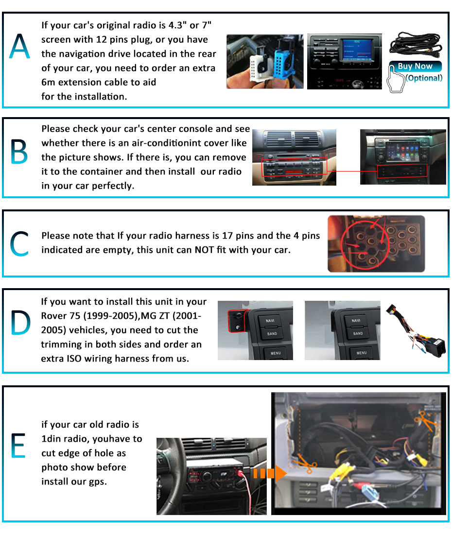 4. Если вы хотите установить этот блок в вашем Rover 75 (1999-2005), MG ZT (2001-2005) транспортных средств, вам нужно отрезать обрезку этого устройства с обеих сторон и заказать дополнительную проводку ISO от нас.