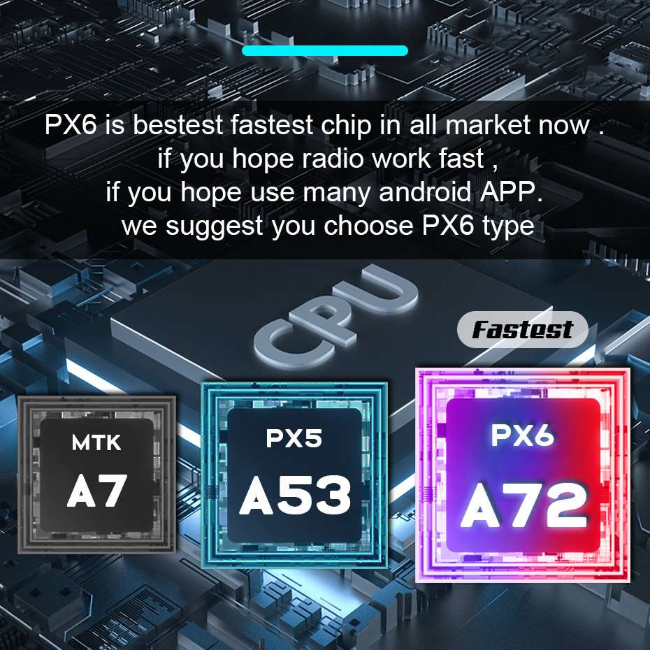 PX6 является лучшим чипом на рынке в настоящее время, он работает быстрее, чем все другие типы. Балл ANTUTU составляет 160770, что лучше 9853 4G + 64G, PX5 и всех других типов 4 + 64G на рынке. По сравнению с другими радио типа fo, PX6 radio может загружать больше видов приложений android с android market, и приложение может работать лучше.