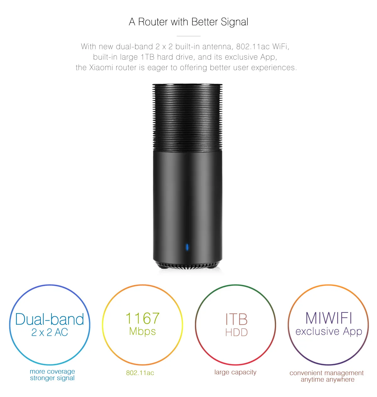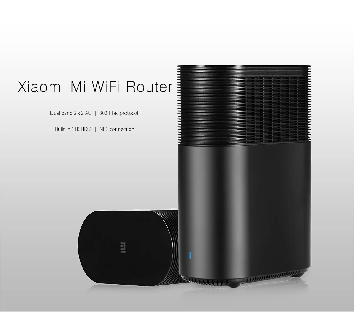 Mi беспроводной маршрутизатор, оснащен 1 ГГц ARM Cortex-A9 двухъядерный процессор, 256 МБ оперативной памяти, ethernet, WiFi, NFC и USB2.0 порт. Он поддерживает скорость до 1167 Мбит/с, как и его мини-версия. Кросс между 802.11ac Wi-Fi роутером и сетевое устройство хранения. Тем не менее, он поставляется с жестким диском на 1 ТБ, чтобы позволить вам хранить файлы, достаточно емкости для загрузки 1000 HD-фильмов, хранения 40,000 песен или сохранения 100,000 фотографий формата RAW. Этот беспроводной маршрутизатор поддерживает двухдиапазонный WiFi 802.11ac и поставляется с его собственным жестким диском на 1 ТБ.