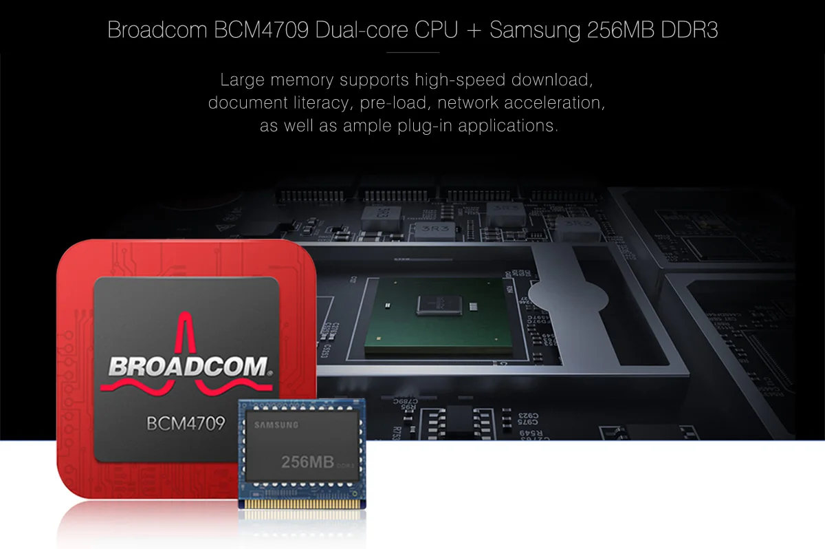 ● Оснащенный Broadcom двухъядерным процессором и микрон/Samsung 256 МБ большая память, может поддерживать стабильные высокоскоростные загрузки, грамотность документов, преднагрузку, сетевое ускорение, а также богатство подключаемых приложений, perfect Play 1 ТБ Емкость жесткого диска Performance