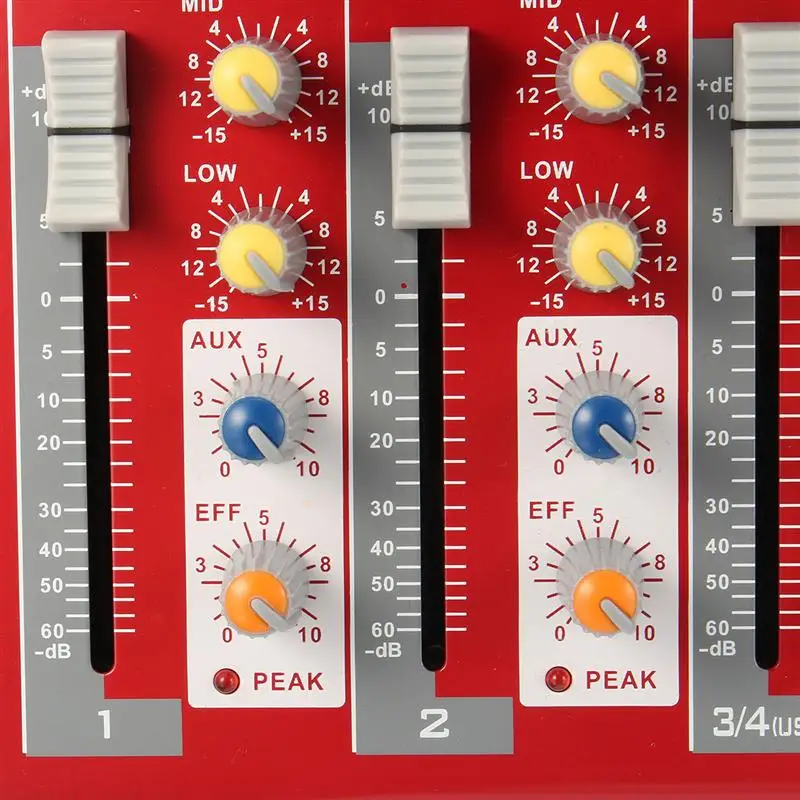 В R4 смеситель имеет 4 канала:Функция первого и второго каналов одинаковая, которая используется для управления входным звуком микрофона, гитары, электронного органа и т. д.Третий канал используется для управления звуком аккомпанементной музыки, то есть входом компьютера, мобильного телефона или U диска.4-й канал контролирует весь миксер, и только после открытия 4-го канала можно управлять тремя другими каналами отдельно.