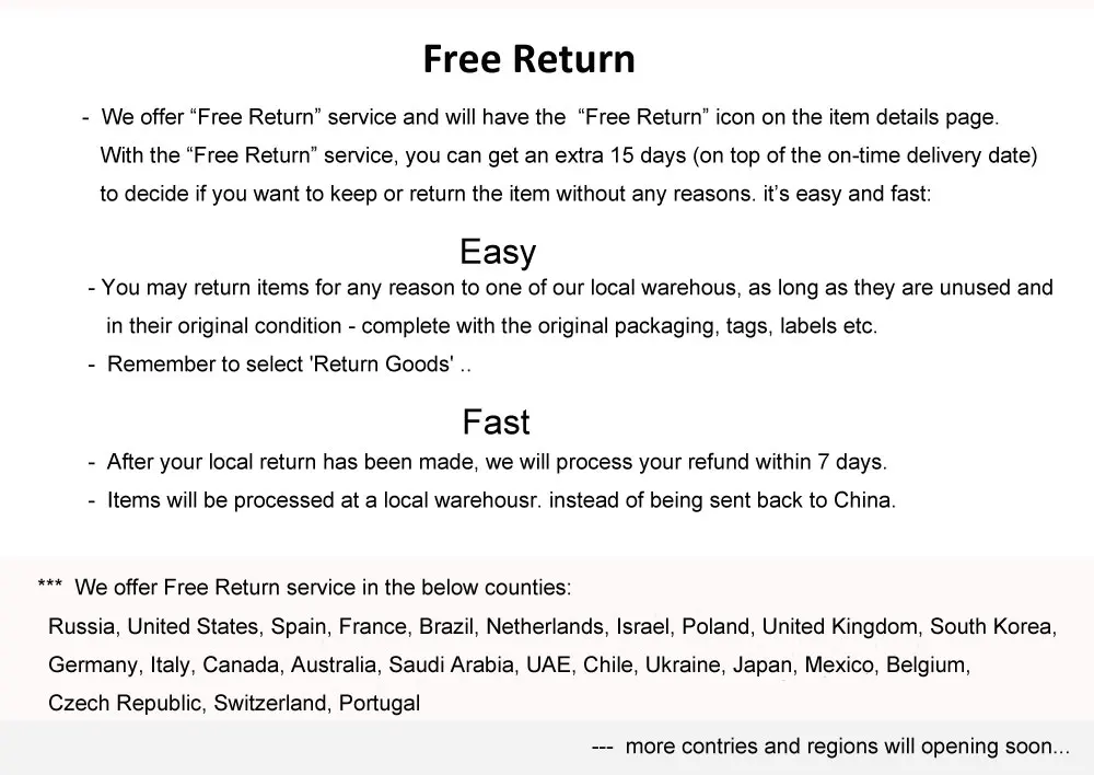 -Мы предлагаем услугу «бесплатный возврат» и на странице деталей товара появится значок «бесплатный возврат». С помощью сервиса «бесплатное возвращение» вы можете получить дополнительные 15 дней (в верхней части даты своевременной доставки) чтобы решить, хотите ли вы сохранить или вернуть товар без каких-либо обоснований. Легко и быстро: