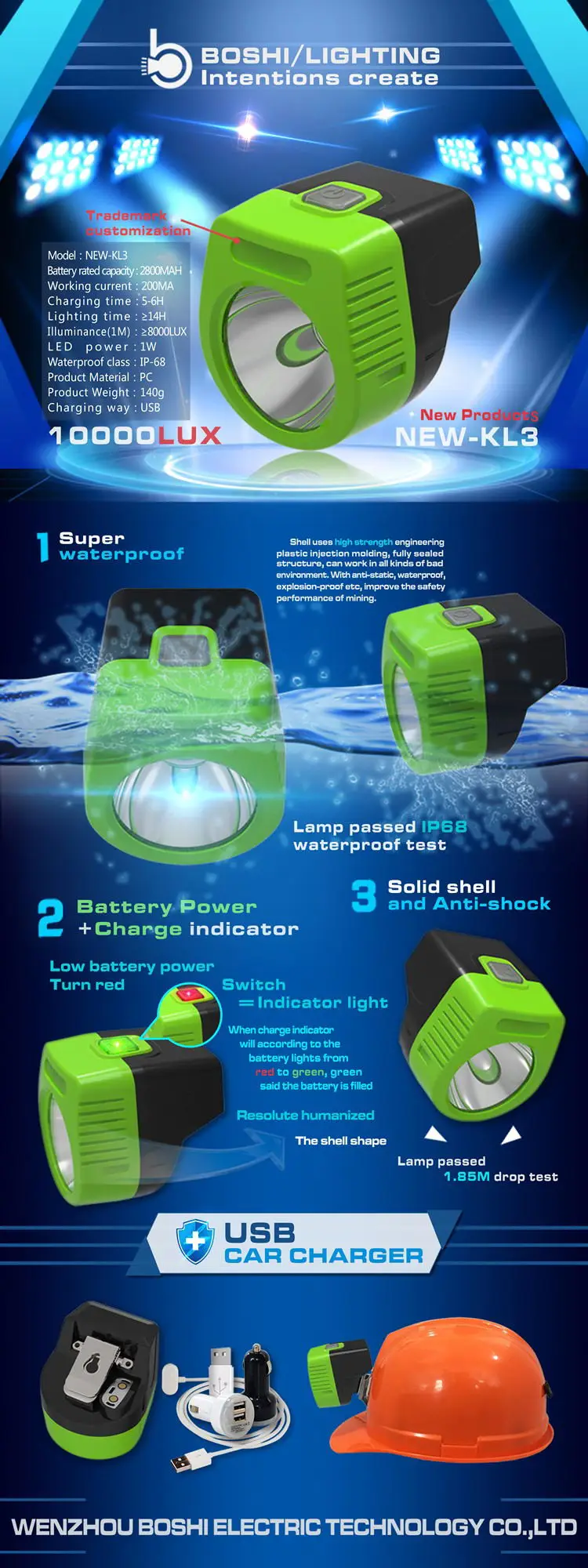 NEW-KL3 прекрасно создан с промышленным, дизайнерским электронным и программным дизайном, производственный Дизайн Новый беспроводной Налобный фонарик. Он имеет прочную, водонепроницаемый, длительное время, характеристики малого объема и светильник вес и т. д. New-KL3 способен выдерживать самые жесткие подземные условия, такие как, угольные шахтеры, металлические шахты и т. Д. Между тем, это своего рода идеальный светильник для гражданского использования, активного отдыха, Освещение для езды и многие другие практические цели. Важные особенности заключаются в следующим образом: