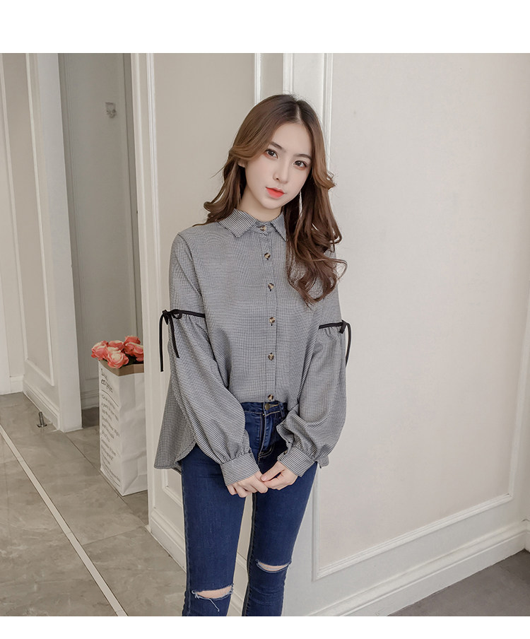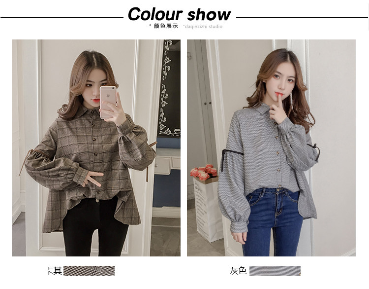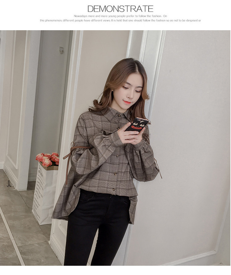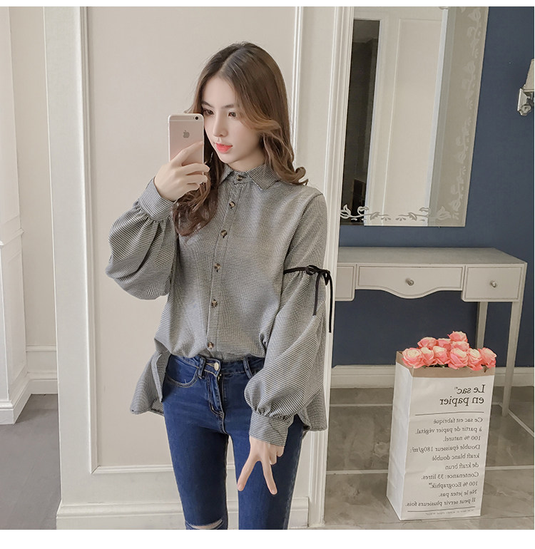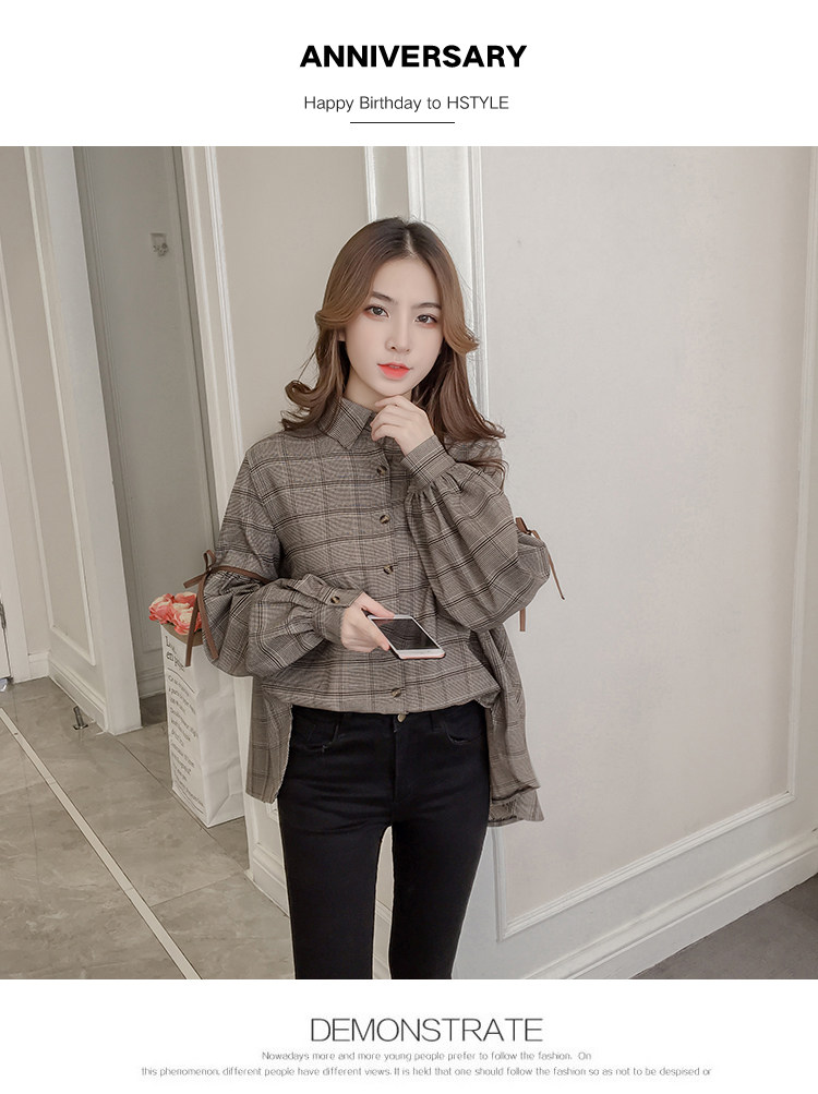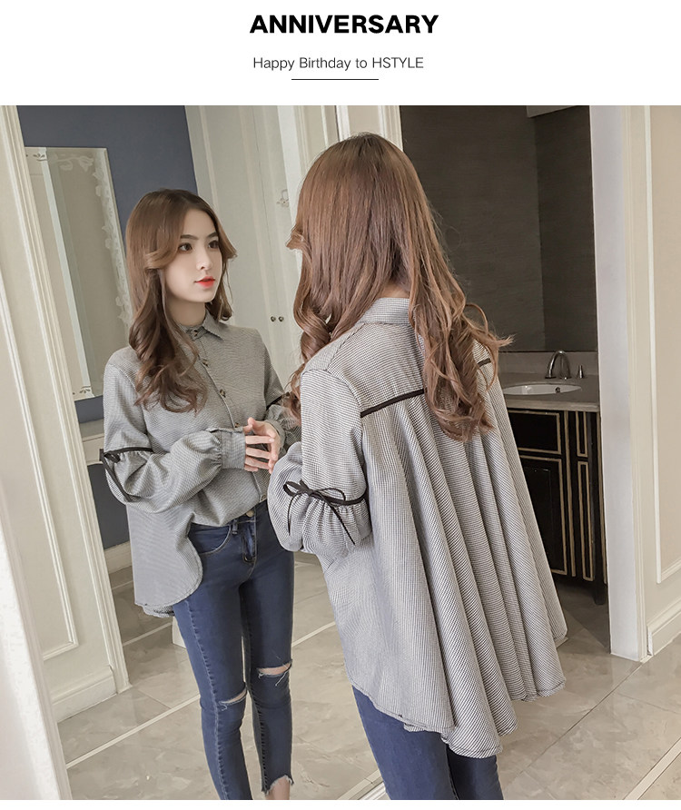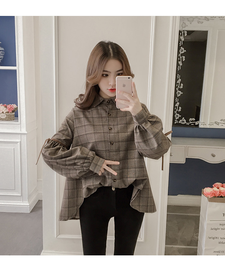 Harajuku, клетчатая женская блузка с длинным рукавом, отложным воротником, бантом, кавайная женская рубашка спереди, короткая сзади, Длинные Нерегулярные блузки E540 <