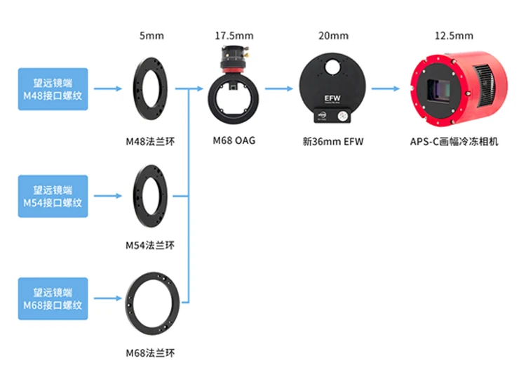 По сравнению со старым 36 мм EFW, новый 36 мм EFW имеет больший объем. Новые винтовые отверстия на передней и задней крышках не только позволяют нам подключать камеру напрямую и сокращать расстояние между фильтром и датчиком камеры, но также делает возможным 36 мм EFW для подключения M68 OAG.