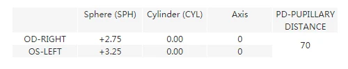 К примеру: 1. Диоптрия (S), 2. Зрачковое расстояние (PD), 3. Цилиндр (C),4. Астигматизм (A)Если у ваших глаз Нет цилиндра, укажите данные, как показано ниже: