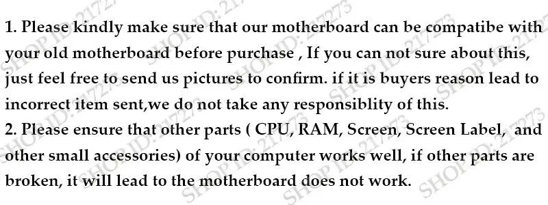 1: материнская плата такая же, как на фотографиях. 2: полный тест перед отправкой. 3: предоставляем 2 месяца гарантии. (старт после получения посылка)
