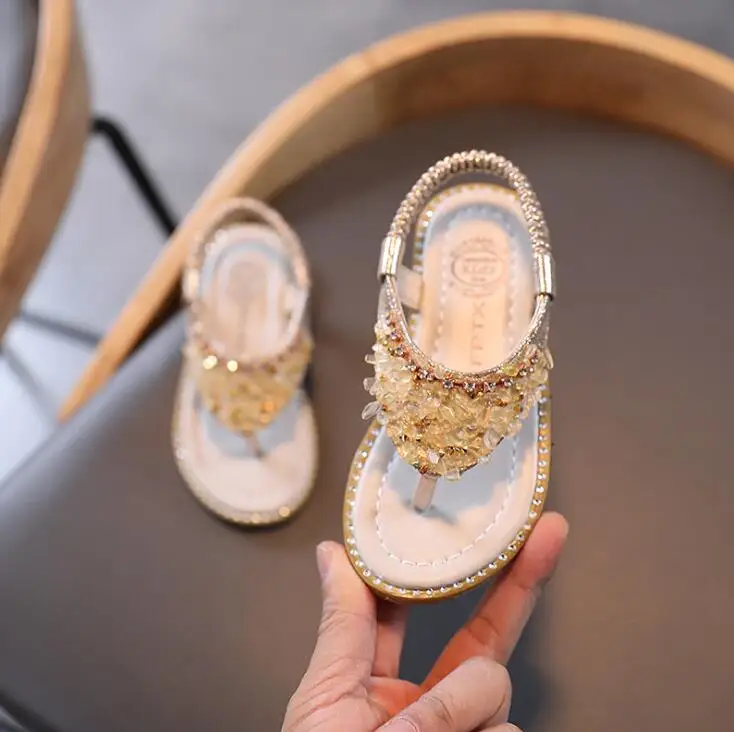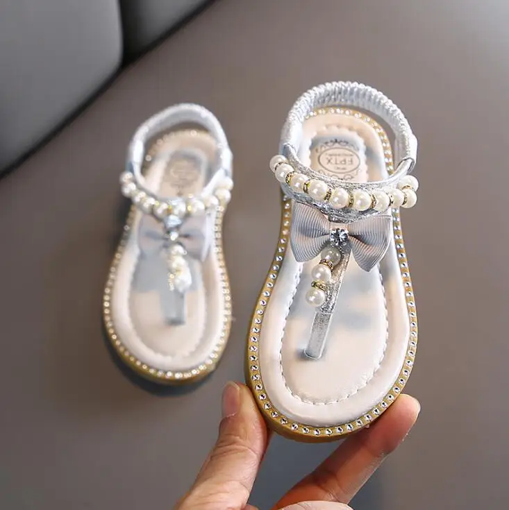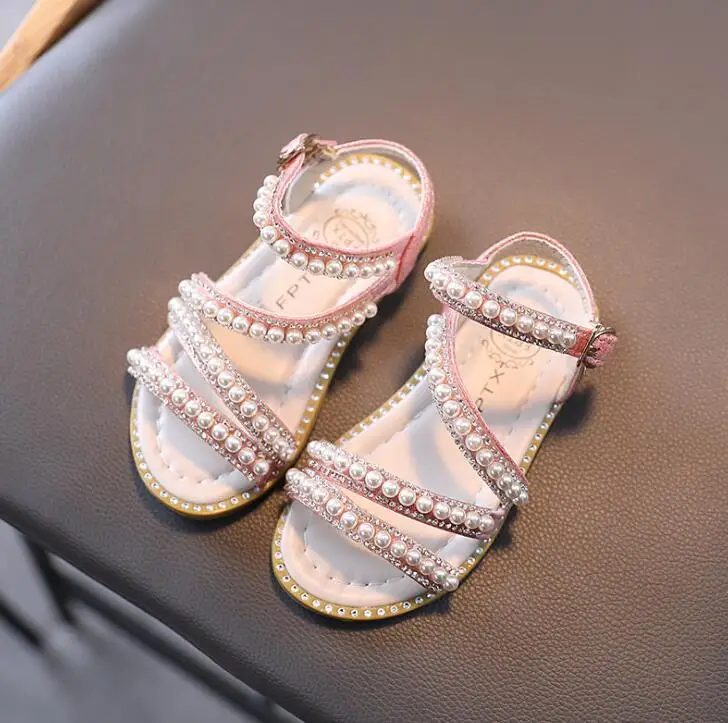 Детская обувь для девочек; Новые летние сандалии; Детские пляжные сандалии на танкетке, украшенные жемчужинами и бусинами; Enfants; Школьная обувь на плоской подошве для малышей; Европейские размеры 21-30