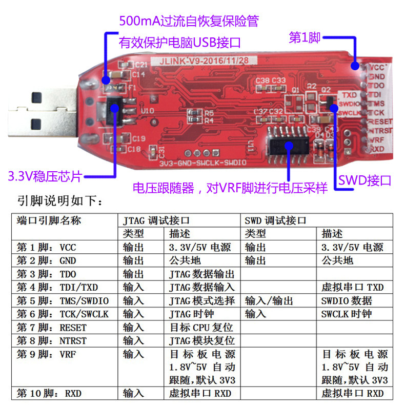 Поддерживает Процессоры: ARM7/9/11 лет, Cortex-A5/A7/A8/A9, Cortex-M0/M1/M3/M4/M7, Cortex-R4, микрочип PIC32 и Renesas RX100/RX200/RX610/RX621/RX62N/RX62T/RX630/RX631/RX63N Поддержка основной рукоятки: STM32, ARM7, ARM9, ARM11, NXP, LPC, S3C2440, NTD ARM Cortex и т. д. Различия между JLink V8 и Jlink V9: 1, различной скорости: V8 поддерживает до 10 м (режим отладки JTAG)/4 м (режим отладки SWD), и Jlink V9 Поддержка до 20 м (режим отладки JTAG) /15 м (режим отладоки SWD). 2, стабильность отличается: V9 Драйвер IC имеет самоадаптивную способность напряжения, в чехол правильной проводки, автоматически адаптируется к напряжению ЦП целевой платы. ЦП 1,8-5,5 В может быть отлажен, а версия V8 может отлаживать только версию ЦП 3,3 В, и стабилизация 5 vcpu очень низкая. 3, JlinkV8 легко выключить прошивку в кирпич. У меня здесь много V8 висят, хочу перенаписать прошивку, а обычные пользователи могут смотреть только на кирпичи, а V9 в основном такой ситуации нет. 4, некоторые из последних cpuV8 больше не поддерживаются, и V9 поддерживает почти все ARM cpu. JLINK V9 шесть характеристик: 1, основной чип управления использует STM32F205, никогда не теряйте прошивки, заводским настройкам по умолчанию, обновление прошивки до последней версии; 2, может обеспечить 3,3 V напряжения для макетная плата 0.8A тока, напряжение постоянного тока 5 V 0.5A ток (первый штифт через Перемычка выбора, заводским настройкам по умолчанию, 3,3 V); 3, поддержка стандартный интерфейс JTAG и 2-проводной интерфейс отладки SWD. Скорость может достигать 20 м (JTAG)/15 м (SWD) в секунду; 4, поддержка всех ARM чип отладки, поддержка для MDK или Мор, а также другие стандартные стандарты JLink поддержка среда компилятора IDE/SATA; 5, оригинальная прошивка, автоматическое обновление прошивки; 6, бессвинцовый процесс, сравнимый с оригинальным;
