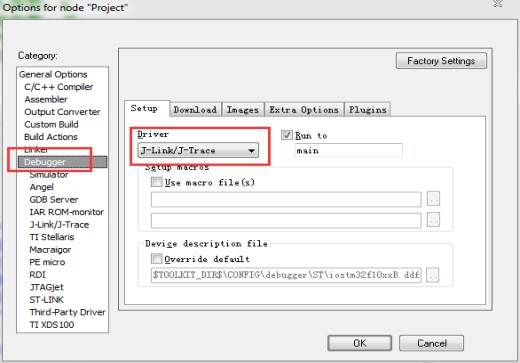 Выберите Setup на закладке Category и J-Link/J-Trace на драйвере