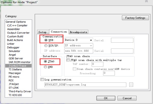 Шаг 2: Выберите подключение на закладке J-Link/J-Trace, где связь выбирает USB,