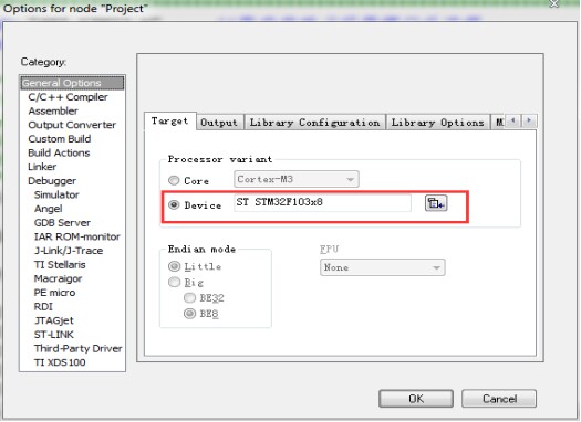 На закладке категория выберите общие параметры. В Target выберите подходящую модель на основе микросхемы целевой платы. Возьмите STM32F103C8TC6 в качестве примера, как показано на следующем рисунке: