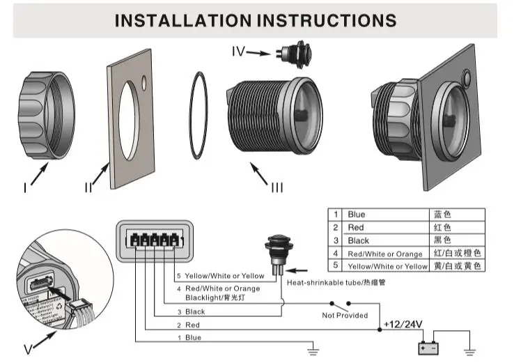 Подключение: красный-аккумулятор (+ 9-32VDC) синий-аккумулятор (-) оранжевый-черный свет (+ 9-32VDC)