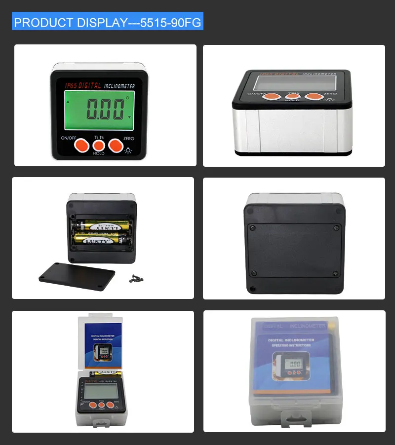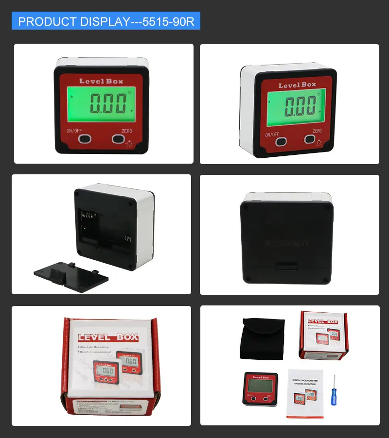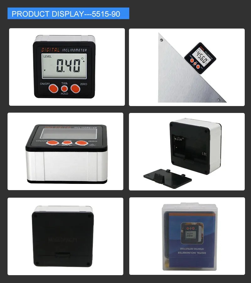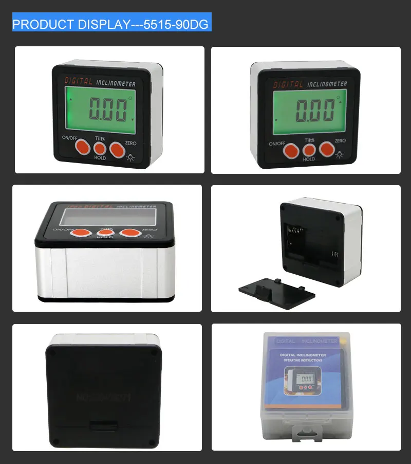 1. Алюминиевый корпус 2. Диапазон измерения 0-90 ° * 4 3. Три функциональных ключа 4. С функцией удержания данных 5. Нулевая Настройка в любом положении 6. Быстрый дисплей измеренного значения на большом ЖК-экране 7. С выключателем питания и автоматическим выключением для опции 8. С магнитами внутри удобно прикрепить к измеренному Железному предмету 9. Только одна сторона с магнитами 10. Отлично подходит для клеевых Пил и настольных пил 11. Портативный размер, удобно сотрудничать с другими измерительными инструментами и увеличить диапазон измерений. 12. Используется для измерения угла в автомобильной, деревообрабатывающей, строительной, буровой технике и т. д.