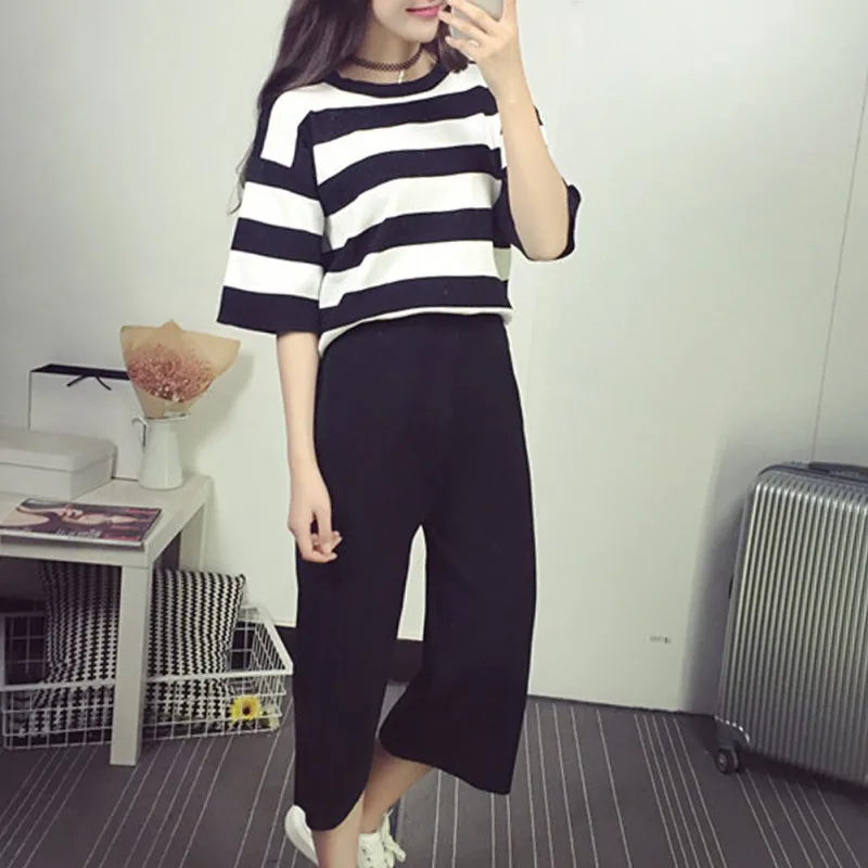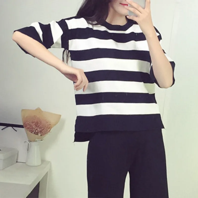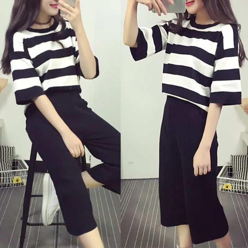 Новый летний костюм из двух предметов, женская модная повседневная полосатая футболка и свободные широкие штаны, комплект цвета морской волны, Conjunto Feminino