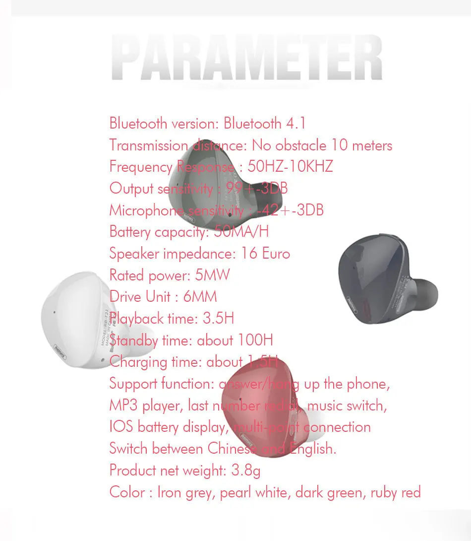 Параметры: Версия Bluetooth: Bluetooth 4,1 Расстояние передачи: без препятствий 10 метров Частотный диапазон: 50 Гц-10 кГц Выходная чувствительность: 99 +-3 дБ Чувствительность микрофона:-42 +-3 дБ Емкость аккумулятора: 50 мА/ч Сопротивление динамика: 16 евро Номинальная мощность: 5 мВт Приводной блок: 6 мм Время воспроизведения: 3,5 H Время ожидания: около 100 Ч Время зарядки: около 1,5 ч Функция поддержки: ответить/повесить телефон, MP3 плеер, повторный набор последнего номера, музыкальный переключатель, IOS дисплей батареи, Многоточечное соединение Переключение между китайским и английским. Вес нетто: 3,8 г Цвет: железно-серый, жемчужно-белый, темно-зеленый, красный рубин