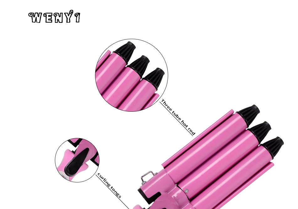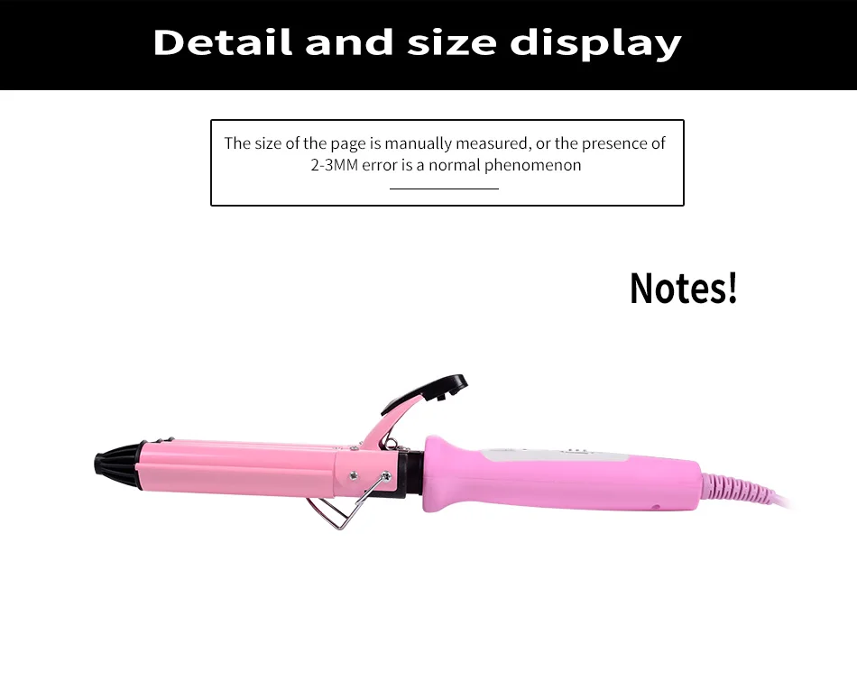 Особенности: Высокое качество и стабильная производительность. Даже распределение тепла от керамических нагревательных элементов. Высококачественные нагревательные пластины из нержавеющей стали. Быстрый нагрев за считанные секунды. Три бочки для легкой эксплуатации и красивых волн "S". 2 см адиабатический и изолированный пластиковый нагревательный баррель заканчивается для легкой эксплуатации, и они могут гарантировать вашу безопасность. Регулируемая температура, это не повредит ваши волосы. Конструкция с двойной изоляцией, более безопасная и надежная. Спецификация: Рабочая температура: 180-210 градусов