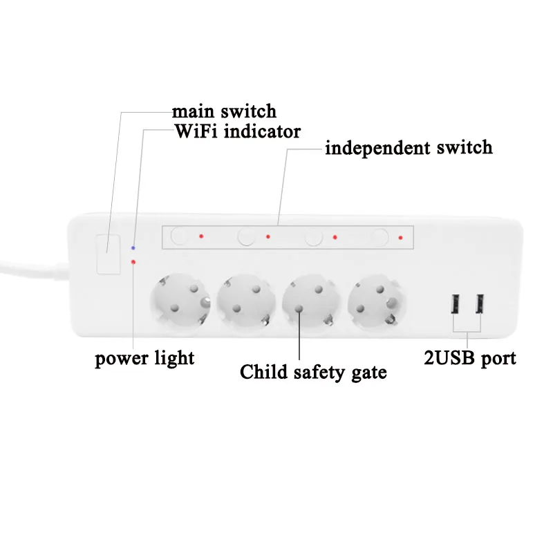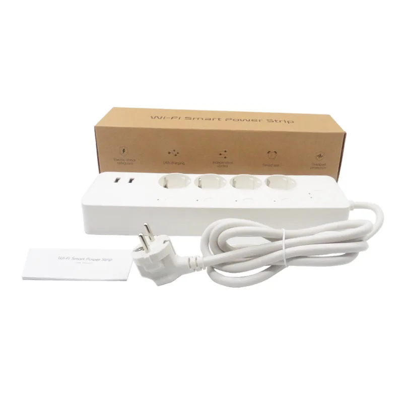 Номинальное напряжение: 250 В Номинальная мощность: 4000 Вт 16А Рабочее напряжение: 250-60 Гц Максимальная нагрузка: 4000 Вт Выход USB: 5 В 3 А Режим управления гнездом: независимое управление Беспроводной Тип: Wi-Fi 2,4 ГГц Беспроводные стандарты: IEEE 802,11 b/g/n Размер: 295x79x38mm