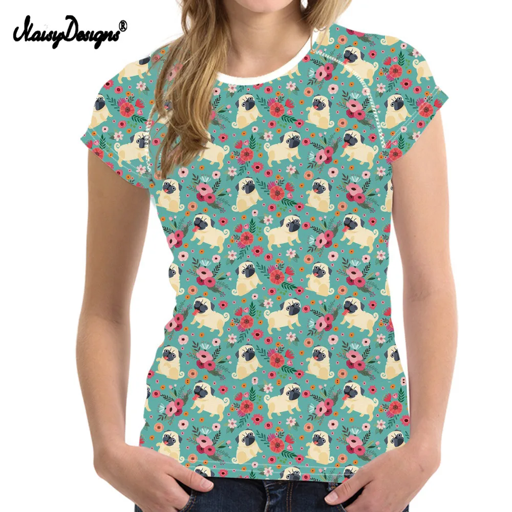 NOISYDESIGNS, забавная Повседневная футболка с коротким рукавом и цветочным принтом мопса, женские футболки, лето-осень 2018, женская футболка, одежда