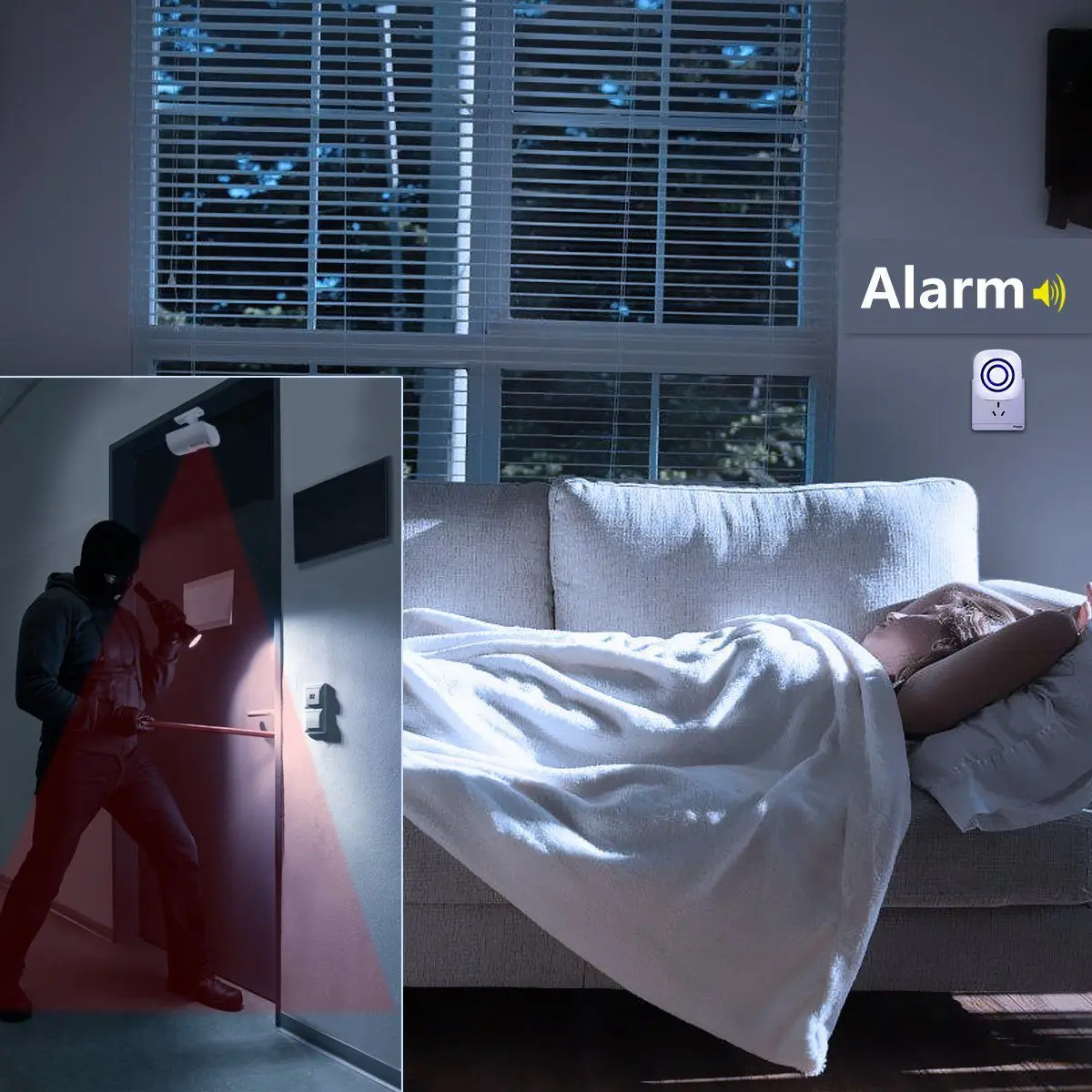 Простая, быстрая, Проводная бесплатная установка: инфракрасный датчик обнаруживает движение и отправляет сигнал на приемник. Выбирал из 38 рингтонов с ярким светодиодный светильник. Датчик настенный.