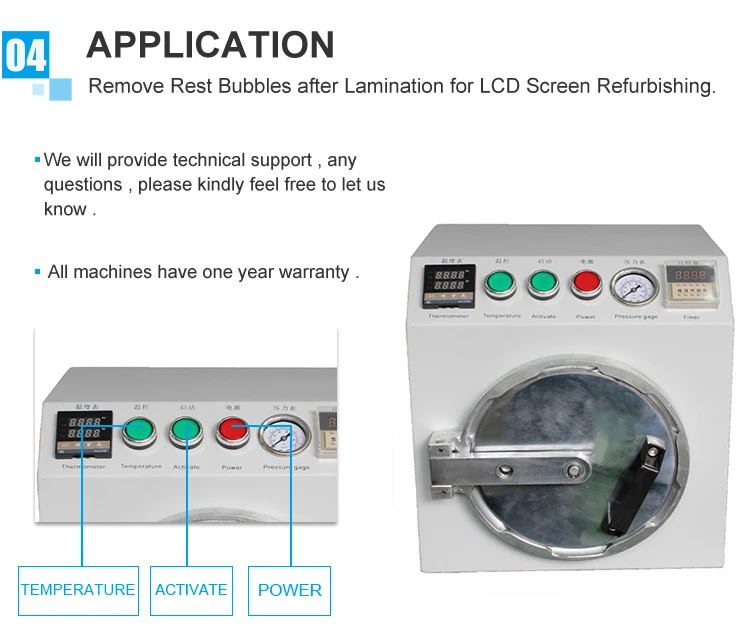 1. Удалите поляризатор, клей OCA и любые пузырьки при ламинировании.2. Уплотнение и разумная структура, нужны только небольшие ареа3. Надежная и блокирующая защита безопасности, сброс автоматически после удаления пузырьков 4. Темпатура, рабочее время и давление регулируются 5. Высокая эффективность 6. Работает быстро и работает автоматически, требуется всего около 15 минут, пузырьки для десятков ЖК-экранов для Iphone4/4s/5/для Samsung, для HTC и т. Д. Все может быть удалено 7. Только подключение к воздуху, машина будет работать плавно