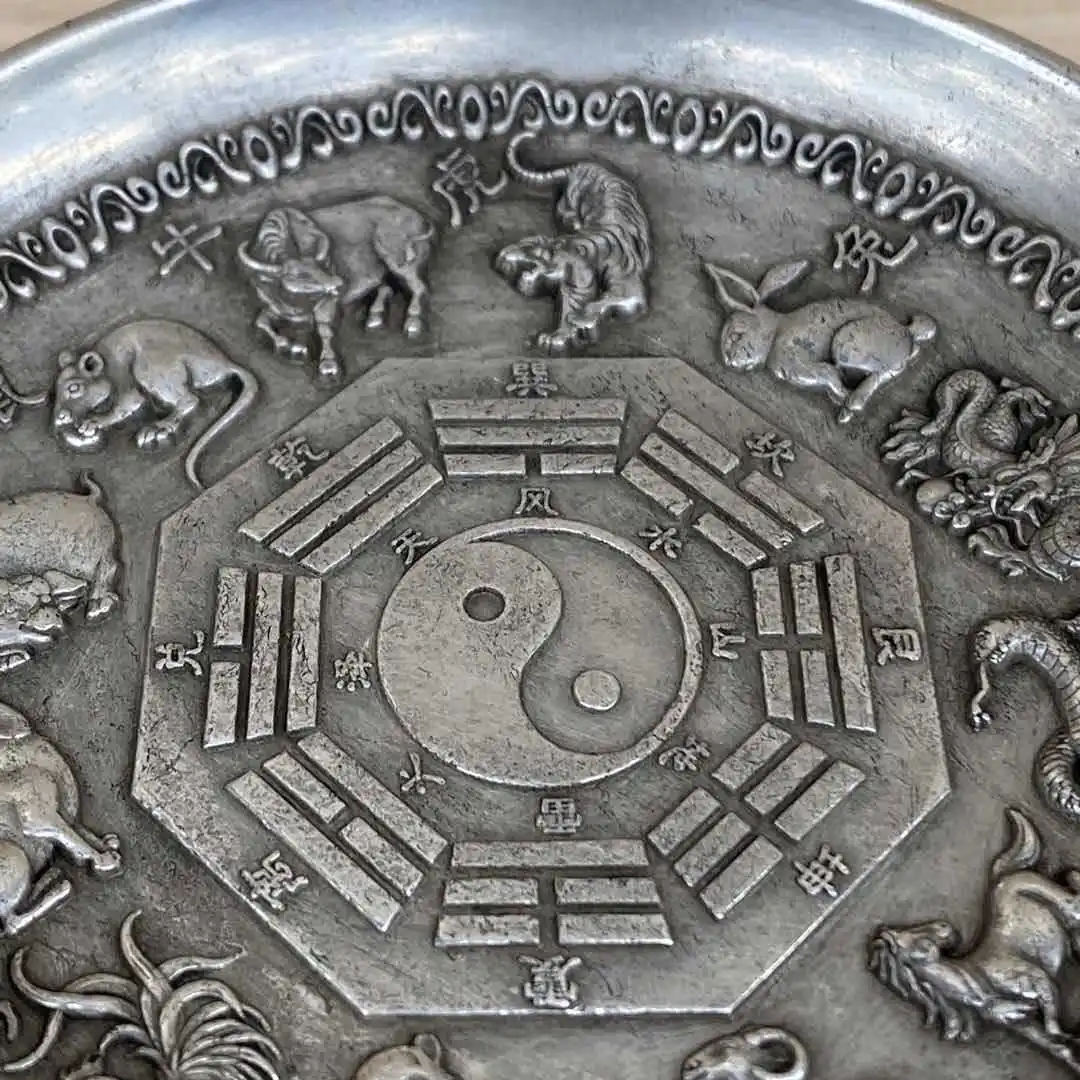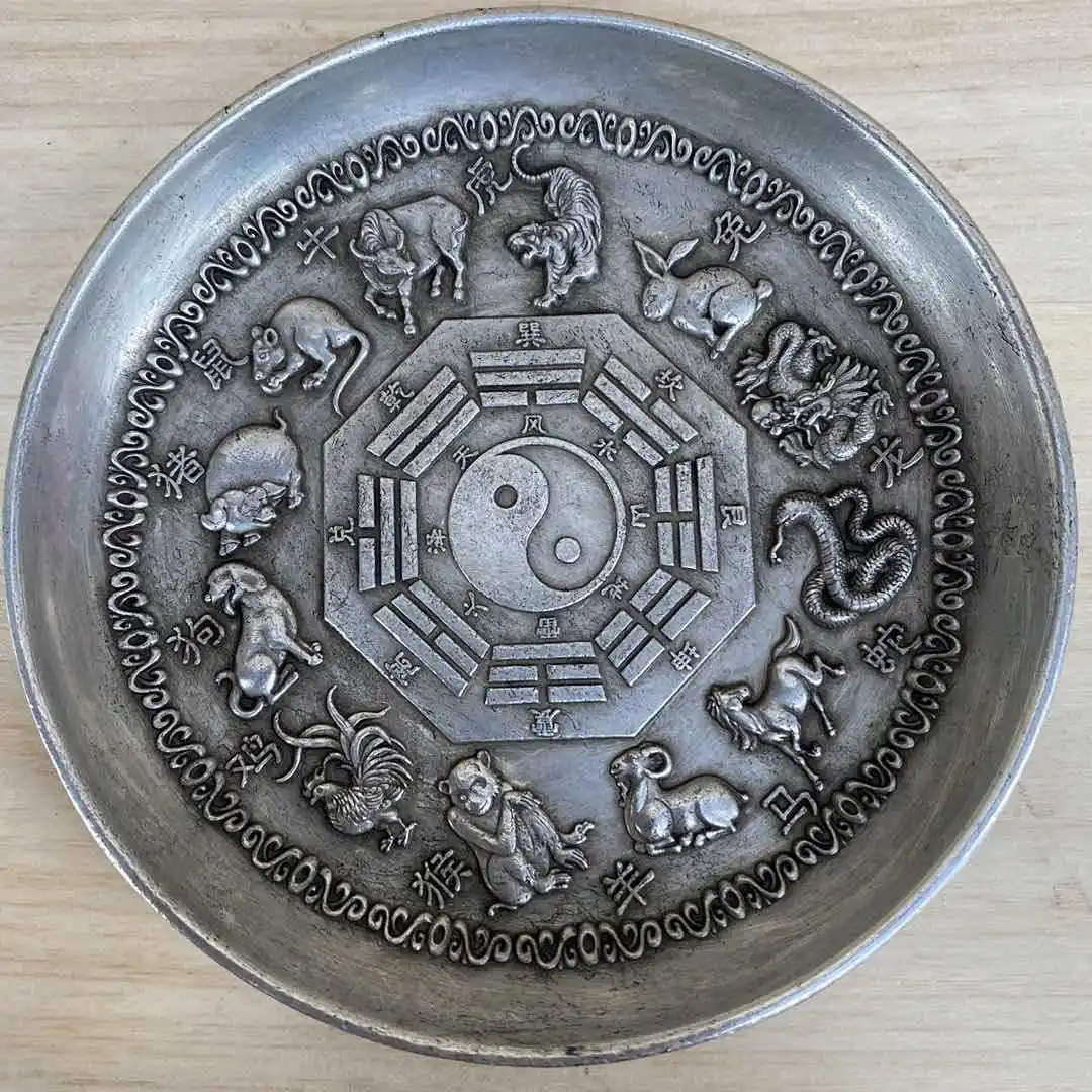 Ремесла статуя дома пластина тонкое мастерство винтажная старая белая медь покрытая серебром зодиака восемь диаграмм пластины