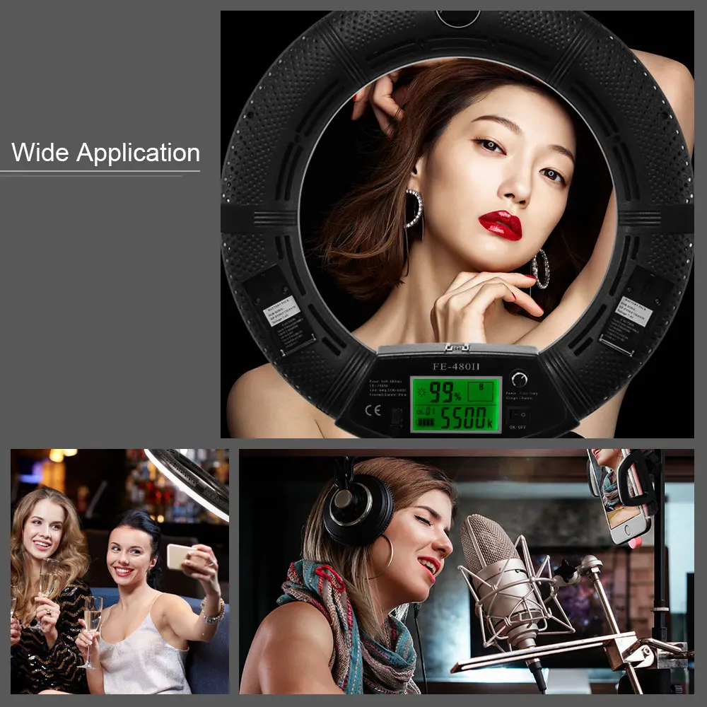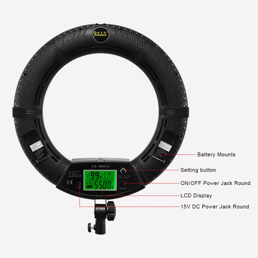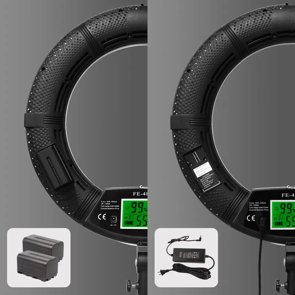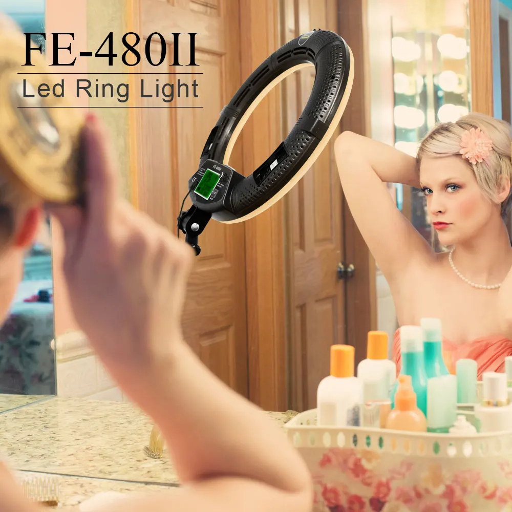 Характеристики: Модель: FE-480 Цветовая температура: 3200K-5500K ± 200K (двухцветная плавная регулировка) Новый дизайн: ЖК-экран, пульт дистанционного управления, Встроенный приемник Мощность: 96 Вт (480 светодиодов) Напряжение: 110-220 В переменного тока/15 В постоянного тока/два аккумулятора SONY 750/970 Световой поток: 3300 Lux/0,5 m, 1000 Lux/1 м Индекс цветопередачи: 95RA Светильник угол: 60 градусов Эффективное расстояние: 30 метров Расстояние управления: 50-80 метров Размер: внешний диаметр: 18 дюймов/45 см Посылка включает в себя: 1x светодиодный светильник FE-480II 1x Шнур Питания 1x адаптер переменного тока 1 панель диффузора 1x Кронштейн для смартфона 1 косметическое зеркало 1 Инструкция 1x пульт дистанционного управления 1 штатив 1х сумка Примечание: аккумуляторы не входят в комплект и могут быть приобретены отдельно