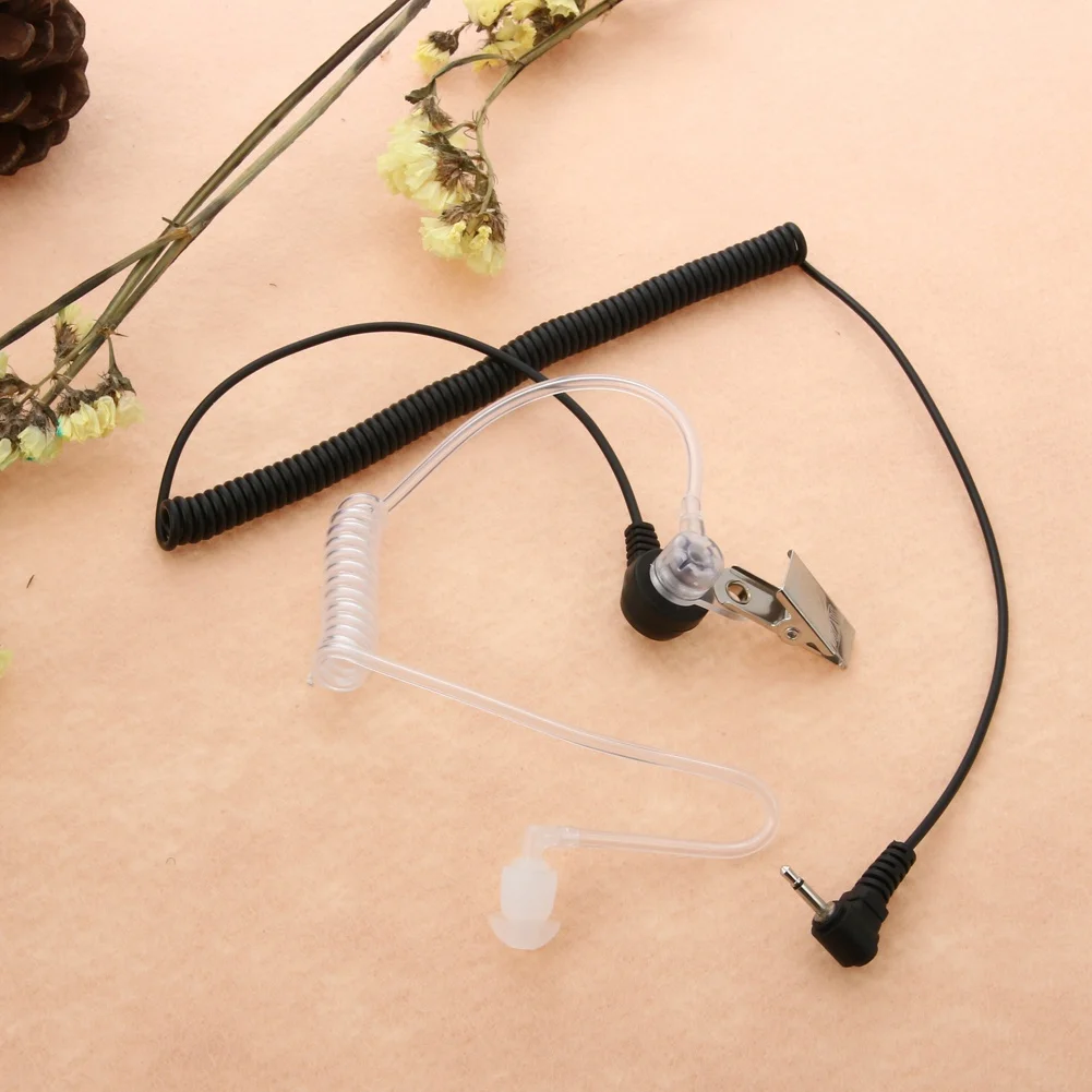 Soft plastic earbud fits snugly to ear.One spare plastic earbud included.